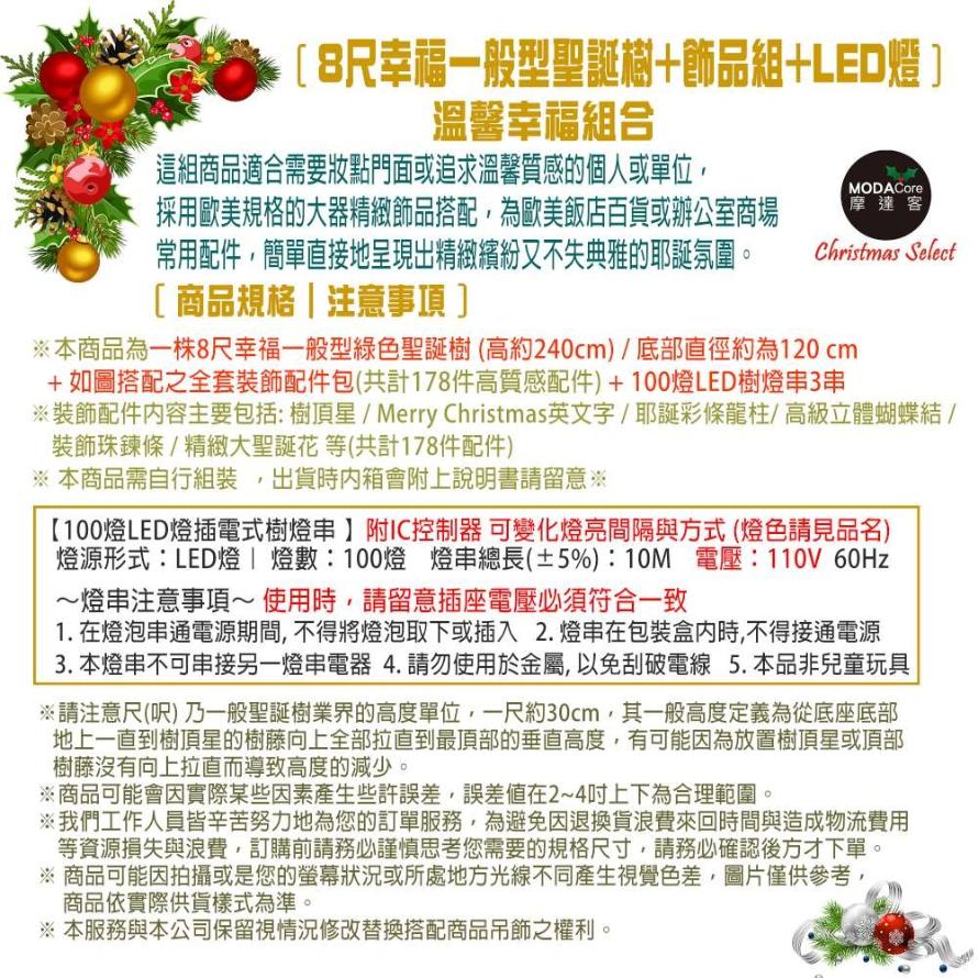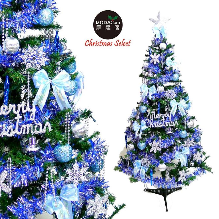 點我下載摩達客幸福8尺一般型裝飾綠聖誕樹藍銀色系配件100燈LED燈3串黃光