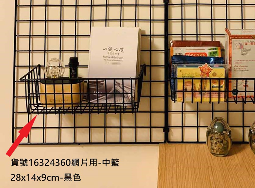 居家置物【中籃-黑】表面烤漆不生鏽,須搭配牆面懸掛,可置放物品用,鐵材質,堅固又耐掛,網狀工具籃,另可搭配掛鉤懸掛物品,適用於廚房、浴室、客廳、房間、書房、倉庫、陽台、商品陳列!