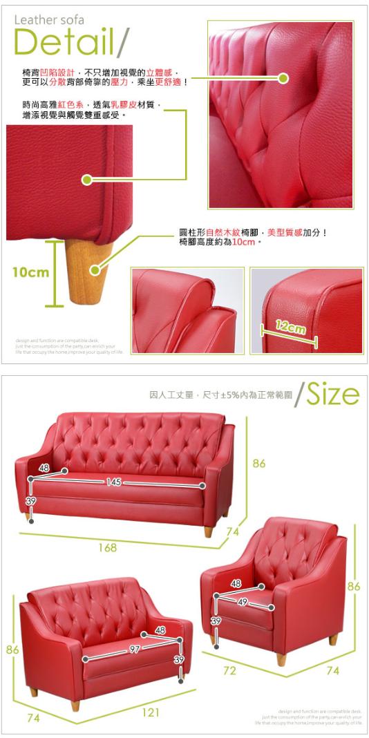 維多利亞沙發組採用乳膠皮製作,透氣度良好、彈性佳。 高密度泡棉坐墊,讓您坐感適中,彈性一級棒。美式設計風格,菱形縫線靠墊設計風格讓您的客廳注入一股活力,帶給您充滿個人品味的居家空間。皮革的防潑水特性,小污漬只需輕加水擦拭,清潔整理超輕鬆,這麼讚的商品怎麼可能不買呢?