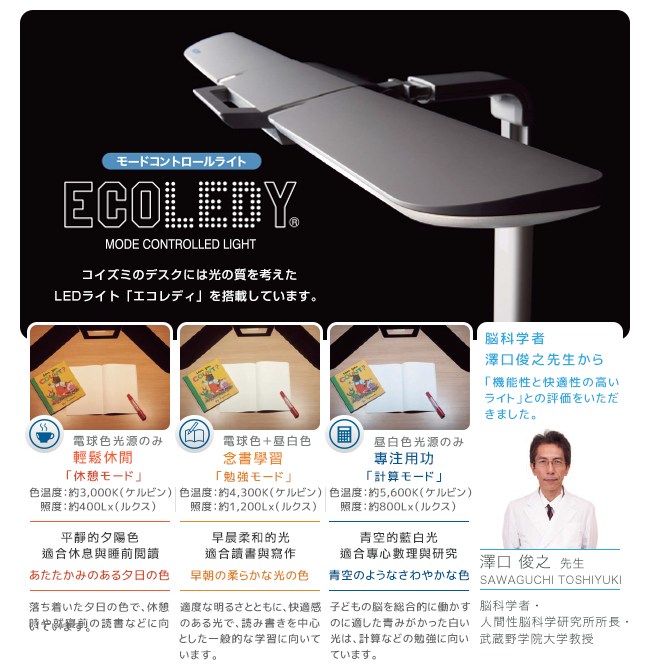 1965年,KOIZUMI照明事業正式開始。歷經半個世紀的改進與研發,開發出適合休閒/念書/專注的三種光色模式。腦科學家・澤口俊之先生推薦,多功能的KOIZUMI LED智慧護眼燈具,對於保護眼睛、孩子的大腦成長發育,有極大的幫助。