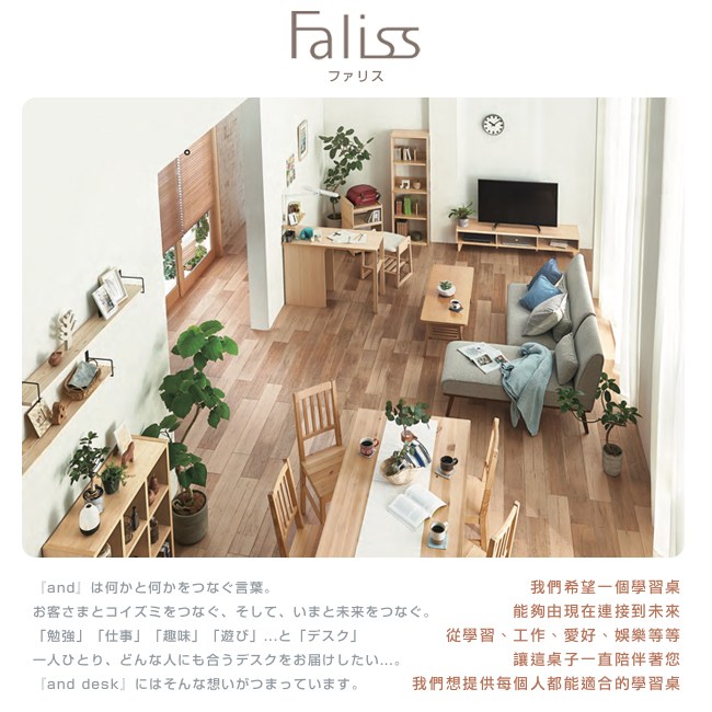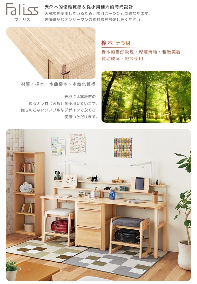我們希望一個學習桌,能夠由現在連接到未來,從學習、工作、愛好、娛樂等等,讓這桌子一直陪伴著您。我們想提供每個人都能適合的書桌組,從學齡到成人,長久的使用下去。高級傢俱專用的橡木,木紋淡雅。時尚外觀的設計,線條簡約脫俗,展現天然木的魅力氛圍。一種優雅的質感,讓品味不言而喻,豐富了對美的感受,讓居家生活的心情,更加的舒服、閒適、平靜。