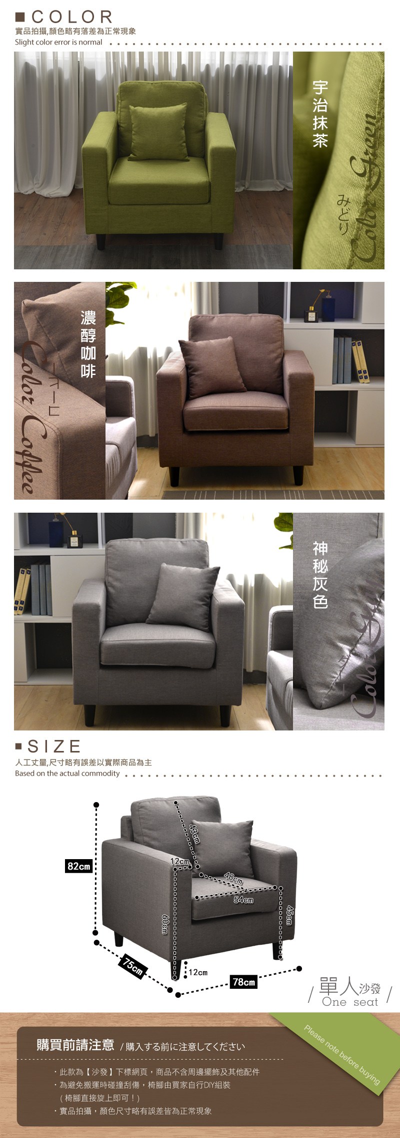 搭配實木原木椅腳設計,提升整張沙發的質感。收到商品後由買家自行DIY旋轉上去即可。
