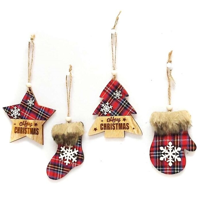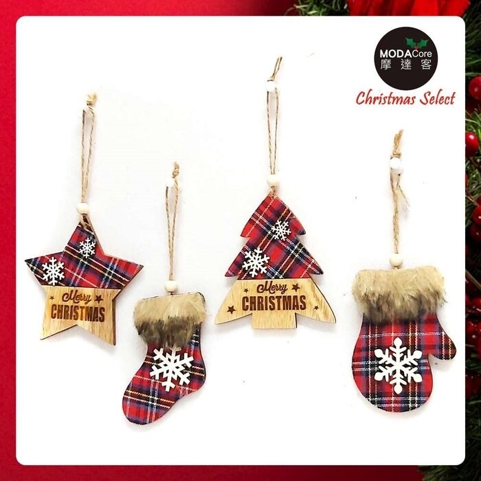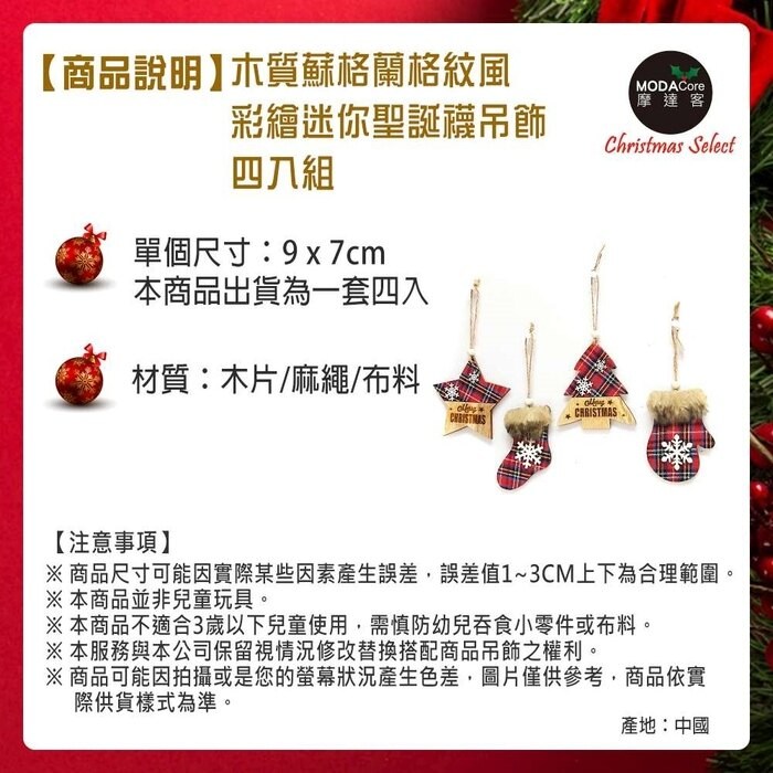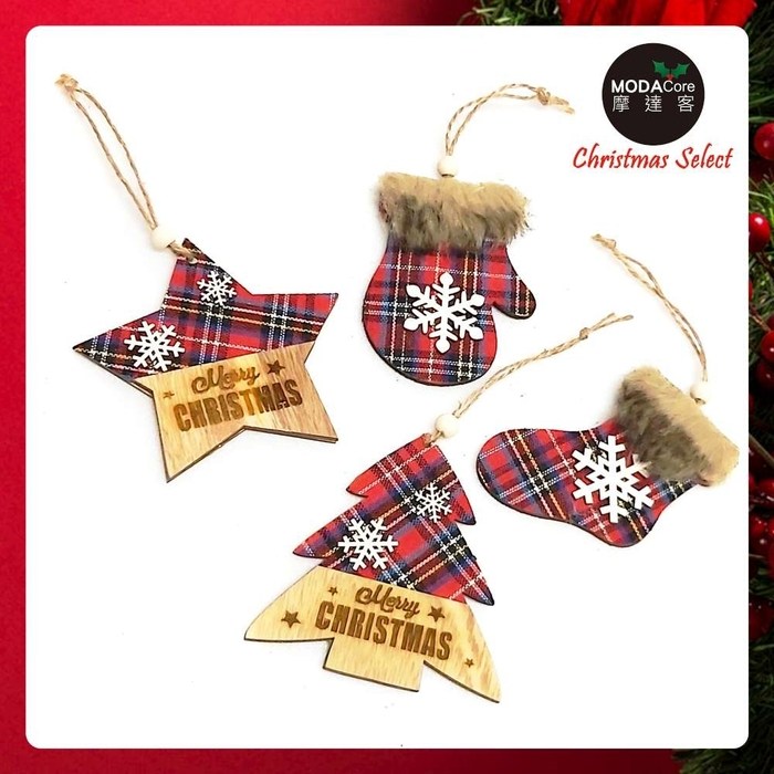 摩達客木質蘇格蘭格紋風彩繪迷你聖誕襪吊飾四入組