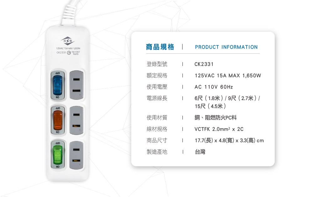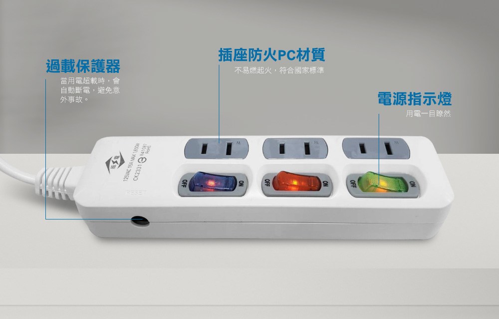 威電 過載斷電3開3座電源線組9呎(CK2332-9)