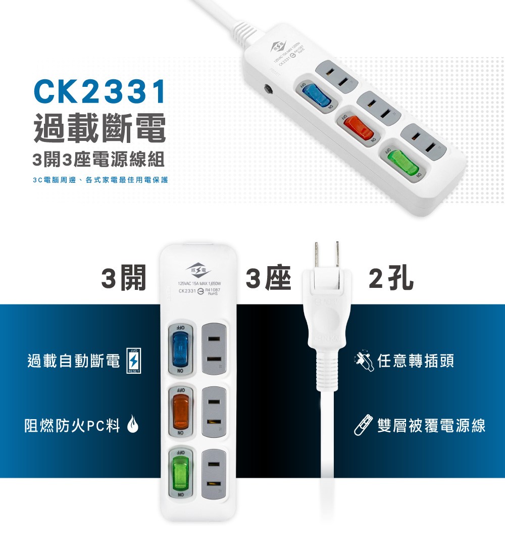【威電】CK-2331-6 2孔3開3座 延長線 6尺/1.8M(180度任轉插頭 過載斷電)