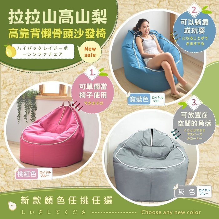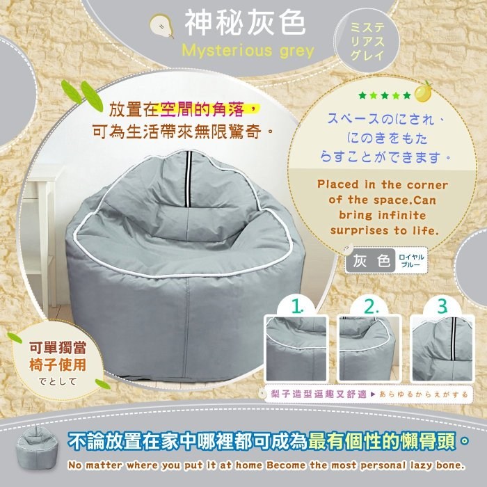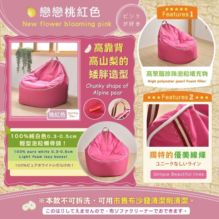 | ●商品名稱: 班尼斯國際名床~拉拉山高山梨‧高靠背懶骨頭~ ~附班尼斯原廠保證卡,品牌經營、品質有保障~ ●商品簡介: (一)可以躺靠、也可以玩耍。 (二)放置在空間的角落,梨子造型逗趣。 (三)不論置於客廳或是和室都非常實用。 (四)可單獨當椅子使用。 (五)仿間懶骨頭都是用便宜的布料或極大顆保麗龍製品製造; 唯有班尼斯給您真正的100%純白色 0.3~0.5cm輕型泡粒懶骨頭! ※本款不可拆洗,可用市售布沙發清潔劑清潔。 ●商品特色: (一)高山梨的矮胖造型,不論置於客廳或是和室皆非常實用。 (二)可以躺靠、也可以玩耍,放置在空間的角落,可為生活帶來無限驚奇。 (三)高聚脂珍珠泡粒填充物是今年日本最流行的材質,能自由流動配合您所要的任何坐姿。 (四)不論放置在家中哪裡都可以成為最有個性的懶骨頭。 ☆坐起來真的悠閒,自由自在! ●商品規格: 1、商品總件數: 拉拉山高山梨懶骨頭*1(不含照片配件以及娃娃) 2、規格:尺寸--長 92cm、寬 92cm、高度 83cm 飽滿札實--圓型梨子球體狀--滿意! 3、顏色:米白色、桃紅、寶藍、神秘灰 4、材質: (1)表面:舒適滌綸布料 (2)內容物:無重力 0.3~0.5cm輕型發泡粒子 5、班尼斯原廠公司貨,附原廠保證卡,品牌經營、品質有保障。 ●選購懶骨頭小常識: 有客戶反應仿間看到很多外型相仿懶骨頭,價格不一,到底差別在哪裡呢? ‧班尼斯商品絕不使用塑膠製成發泡板(簡稱:EVA)。 ‧班尼斯商品絕不偷工減料添加任何雜物、雜色泡綿及回收廢料。 ※唯有班尼斯堅持內容物:100%無重力"純白色"0.5cm發泡粒子,清澈明亮,乾淨滿分。 100%絕不添加任何廢棄雜物、廢料泡綿降低製造成本。 ※市面無印良品及日本MOGU懶骨頭都是堅持100%純白色發泡粒子,唯有精品才會這樣堅持! ‧偷工減料拼價格非我族類、尺寸縮小拼俗仔其心可議,買家應有判斷能力。 ※唯有~認明內外兼俱、專業生產懶骨頭-『班尼斯國際名床』,才是您最佳選擇!