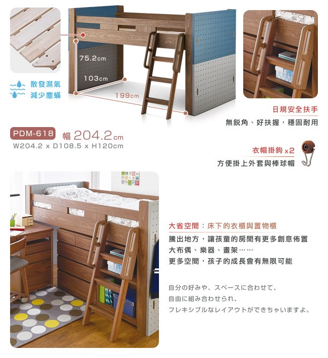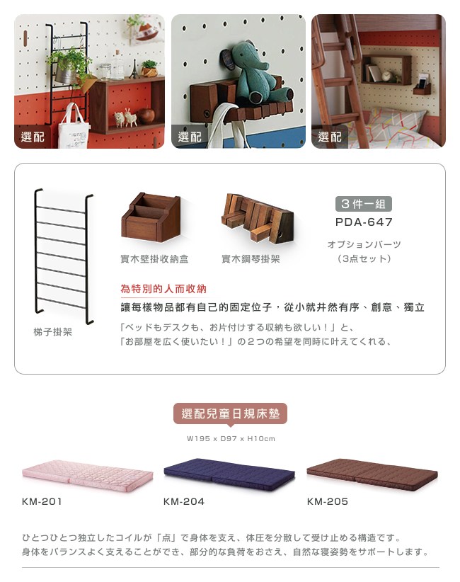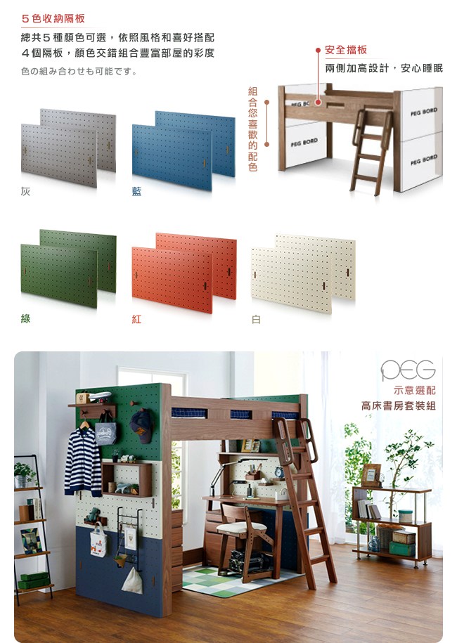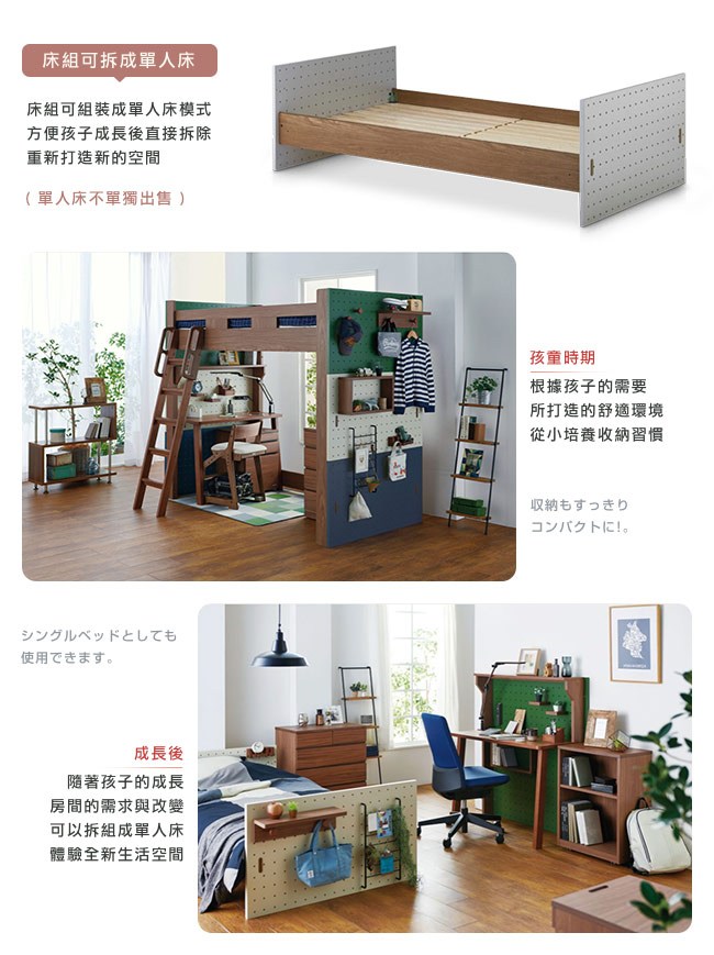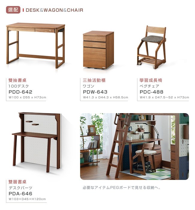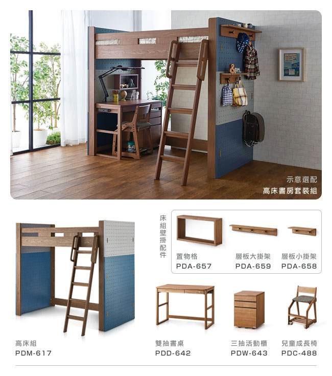 實木溫潤、沈穩的質感,無窮創意的組合變化。書房套裝組的佈置,完美空間的演出。放入每個您用心挑選的配件,從高床、中床組,以及雙層床組,其中另有床組專屬配件,方便擺設小物品,與吊掛帽子、外套、書包。小小的空間,卻是沒有侷限的收納。搭配書桌、兒童成長椅、活動櫃、還有置物櫃,擺放書籍、飾品、衣物,一應俱全的小書房,形成獨一無二的風格。好的傢俱、好的習慣、感受與眾不同的生活。