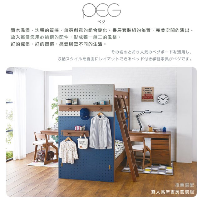 實木溫潤、沈穩的質感,無窮創意的組合變化。書房套裝組的佈置,完美空間的演出。放入每個您用心挑選的配件,從高床、中床組,以及雙層床組,其中另有床組專屬配件,方便擺設小物品,與吊掛帽子、外套、書包。小小的空間,卻是沒有侷限的收納。搭配書桌、兒童成長椅、活動櫃、還有置物櫃,擺放書籍、飾品、衣物,一應俱全的小書房,形成獨一無二的風格。好的傢俱、好的習慣、感受與眾不同的生活。