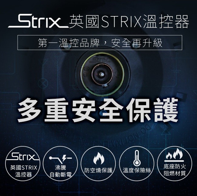(7) 採用英國STRIX溫控器,沸騰自動斷電、防空燒保護、溫度保險絲,多重安全保護,使用更安心