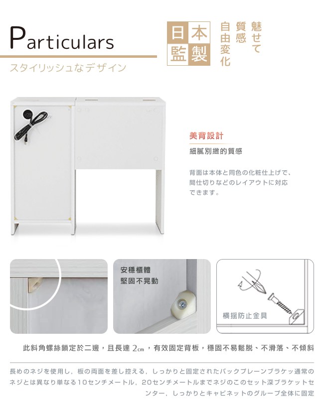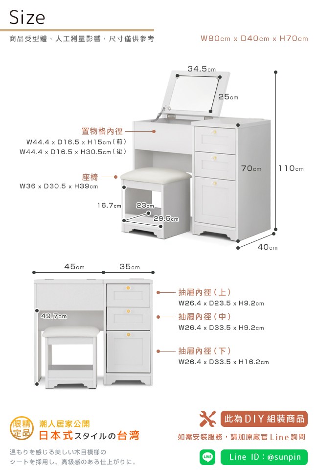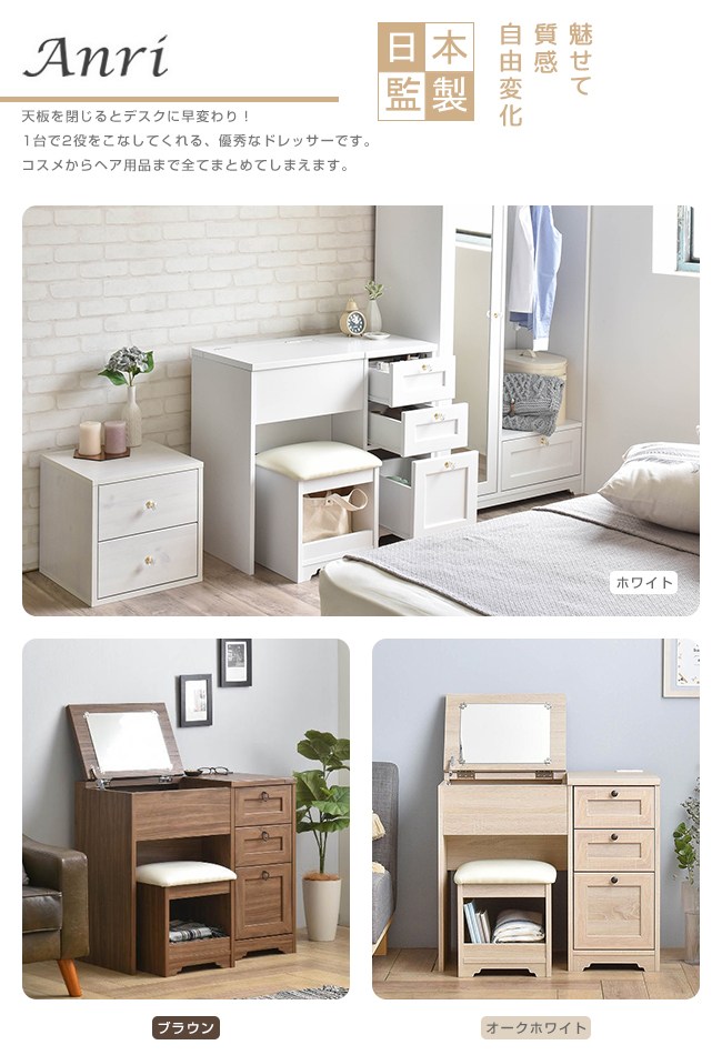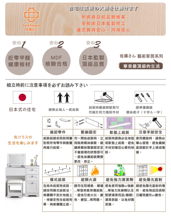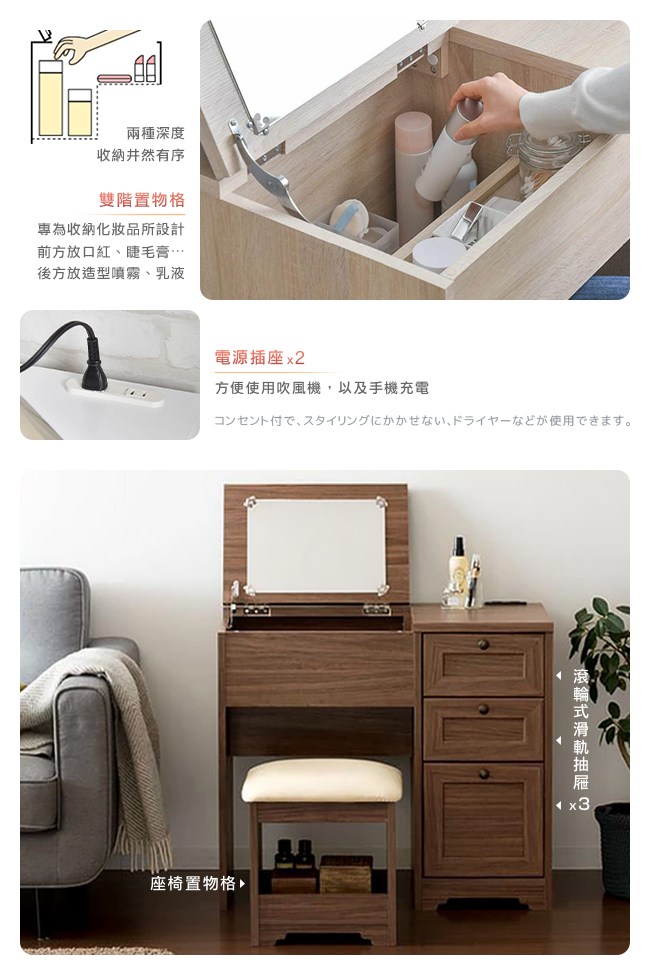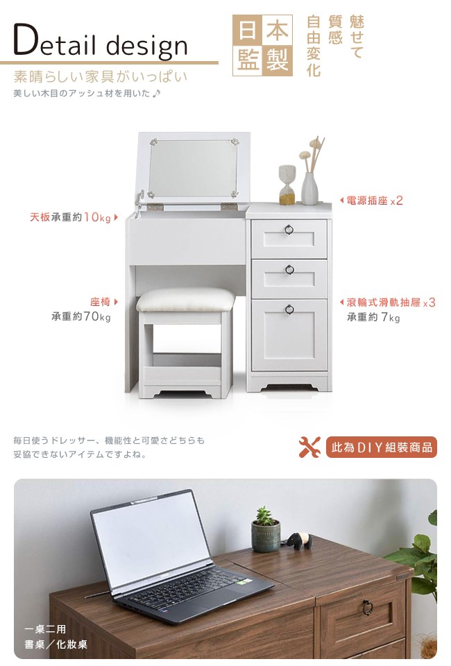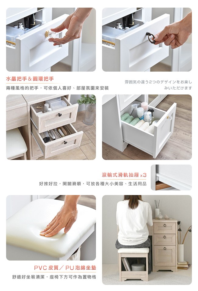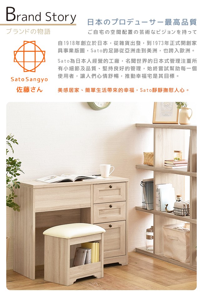 【Sato】日本家具品牌,職人專業工藝,講究獨特的細緻、追求質感的細節,完美演繹,優美居家的生活空間。一桌二用:書桌/化妝桌,小巧的設計,不佔用空間,可將所有美妝、保養品都妥善收納其中。上掀鏡面,開關順暢自如,方便化妝,讓每日充滿自信。下方的雙階置物格,兩種深度,讓各款口紅、睫毛膏、造型噴霧、乳液等等,井然有序的整理好。桌面電源插座,方便使用吹風機,以及手機充電。可依個人喜好、部屋氛圍,選擇水晶或圓環把手來安裝。滾輪式滑軌抽屜,好推好拉,開關滑順,可放各種大小美容、生活用品。座椅 PVC 皮質/PU 泡綿坐墊,舒適好坐易清潔,下方可作為置物格。美背設計,細膩別緻的質感。