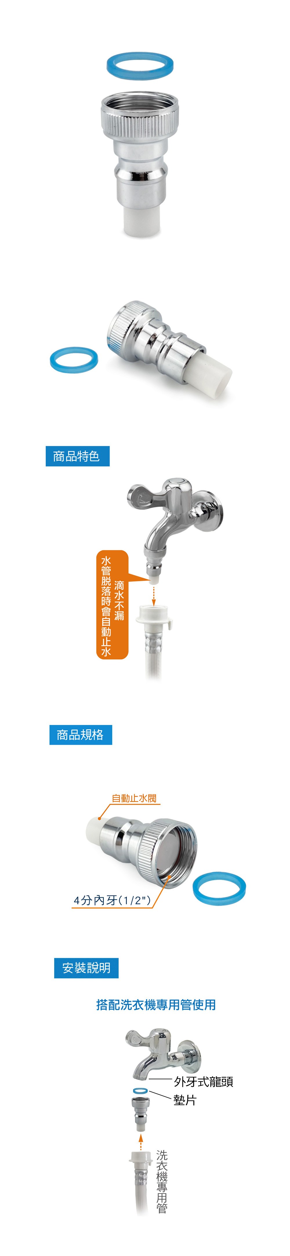神崎家居 全銅洗衣機噴槍脫落自動止水4分接頭 附墊片 安裝簡易  1個  ZVC2
