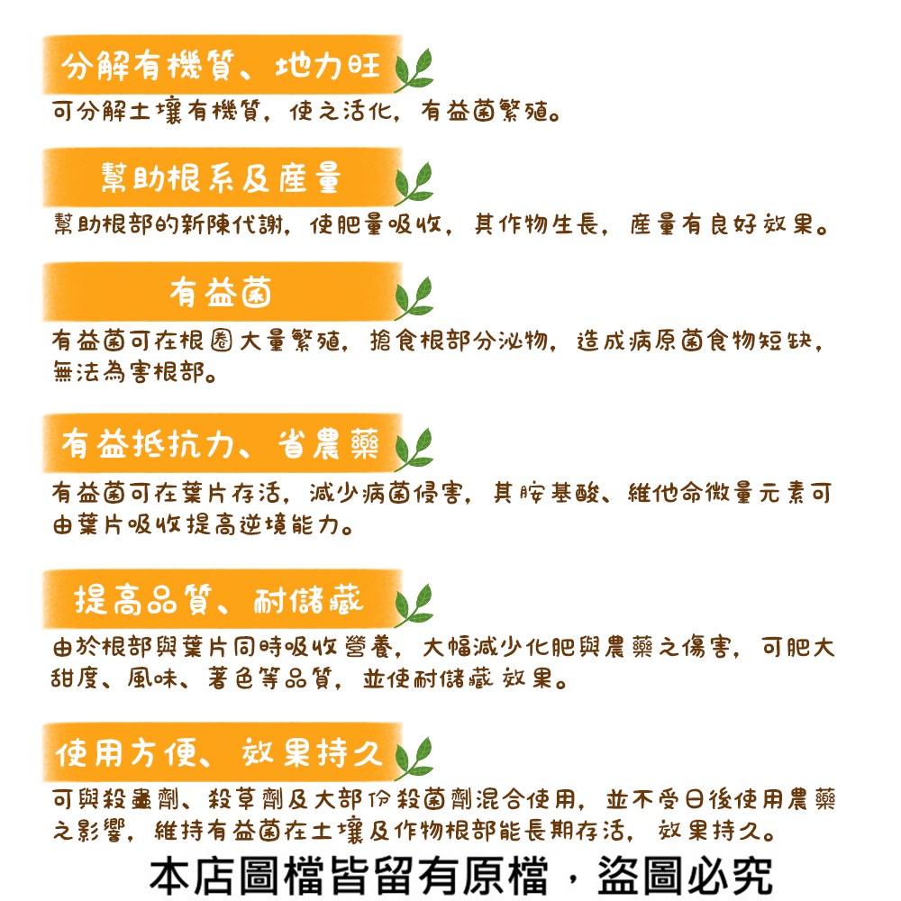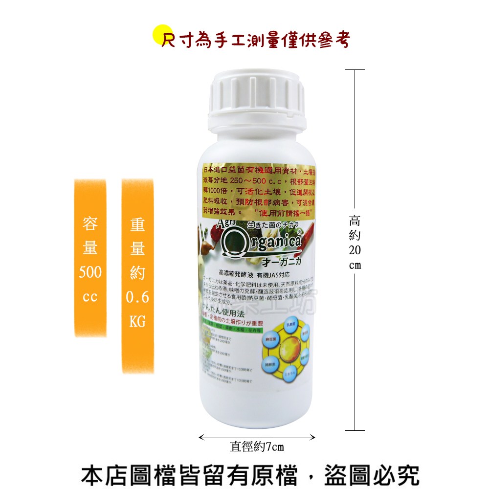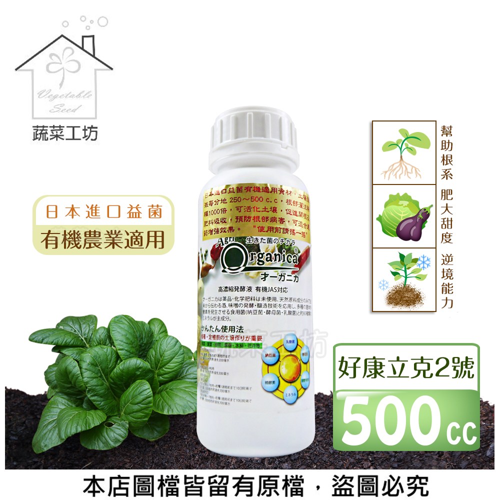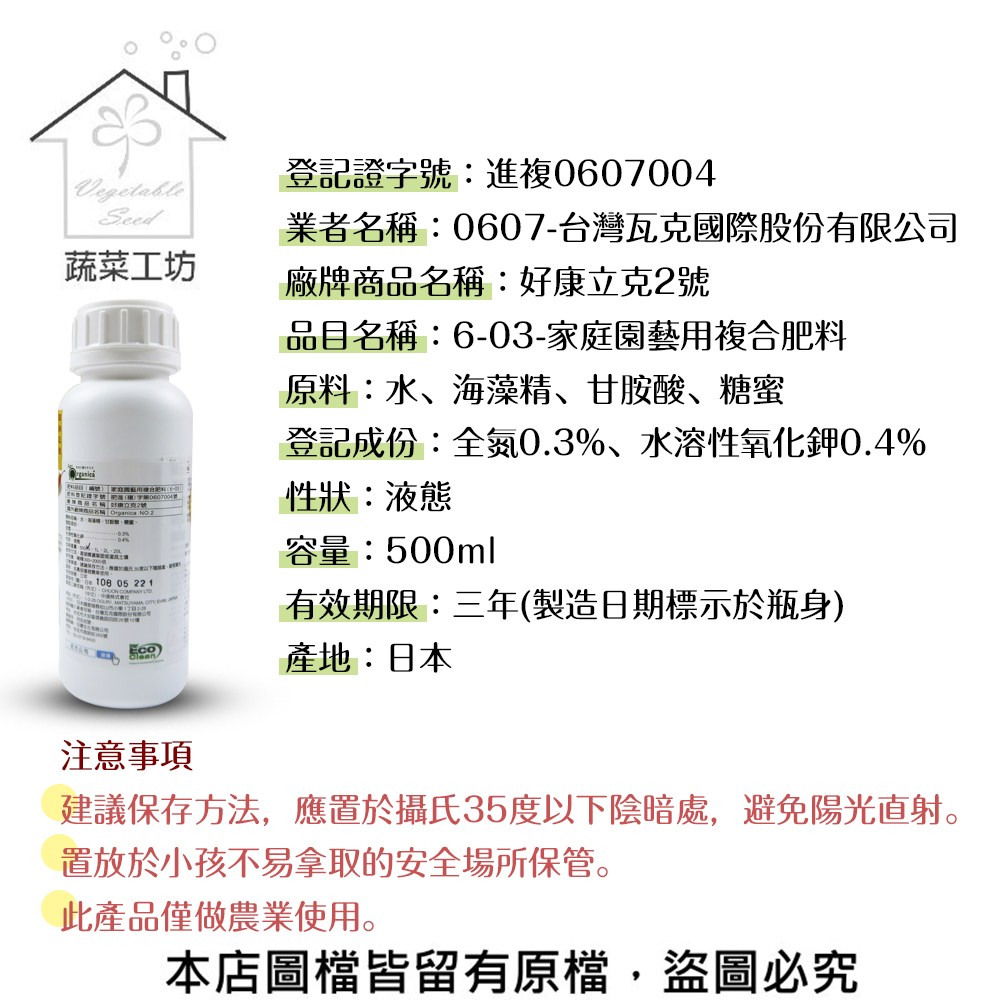 | 【蔬菜工坊】好康立克2號500cc 尺寸大小 高約20公分*直徑7公分 重量約0.6公斤 容量500cc (尺寸為手工測量僅供參考) 產品特色 ●分解有機質、地力旺:可分解土壤有機質,使之活化,有益菌繁殖。 ●幫助根系及產量:幫助根部的新陳代謝,使肥量吸收,其作物生長,產量有良好效果。 ●有益菌:有益菌可在根圈大量繁殖,搶食根部分泌物,造成病原菌食物短缺,無法為害根部。 ●有益抵抗力、省農藥:有益菌可在葉片存活,減少病菌侵害,其胺基酸、維他命微量元素可由葉片吸收提高逆境能力。 ●提高品質、耐儲藏:由於根部與葉片同時吸收營養,大幅減少化肥與農藥之傷害,可肥大甜度、風味、著色等品質,並使耐儲藏效果。 ●使用方便、效果持久:可與殺蟲劑、殺草劑及大部份殺菌劑混合使用,並不受日後使用農藥之影響,維持有益菌在土壤及作物根部能長期存活,效果持久。 使用量 建議稀釋300-2000倍 ●土壤灌溉:每分地250~500cc ●根部灌注:稀釋1000倍 ●噴灑葉面:稀釋1000倍 ※使用前請搖一搖 詳細資訊 登記證字號:進複0607004(此字號有效期限至113/06/27) 業者名稱:0607-台灣瓦克國際股份有限公司 廠牌商品名稱:好康立克2號 品目名稱:6-03-家庭園藝用複合肥料 原料:水、海藻精、甘胺酸、糖蜜 登記成份:全氮0.3%、水溶性氧化鉀0.4% 性狀:液態 容量:500ml 有效期限:三年(製造日期標示於瓶身) 產地:日本 登記證字號:進複1066002 業者名稱:1066-元霖實業有限公司 廠牌商品名稱:好康立克2號 品目名稱:6-03-家庭園藝用複合肥料 原料:海藻精、甘胺酸、糖蜜 登記成份:全氮0.3%、水溶性氧化鉀0.4% 性狀:液態 容量:500ml 有效期限:三年(製造日期標示於瓶身) 產地:日本 ⚠注意事項: ●建議保存方法,應置於攝氏35度以下陰暗處,避免陽光直射。 ●置放於小孩不易拿取的安全場所保管。 ●此產品僅做農業使用。 *超商寄送限制最大購買數量:單品項7罐 *商品所在地/出貨地:彰化 *因電腦解析度不同,所以會與實品有色差,商品顏色以實際為主,造成不便,敬請見諒喔! *商品一律不提供試用,一經拆封或使用,請恕無法提供退換貨喔! |