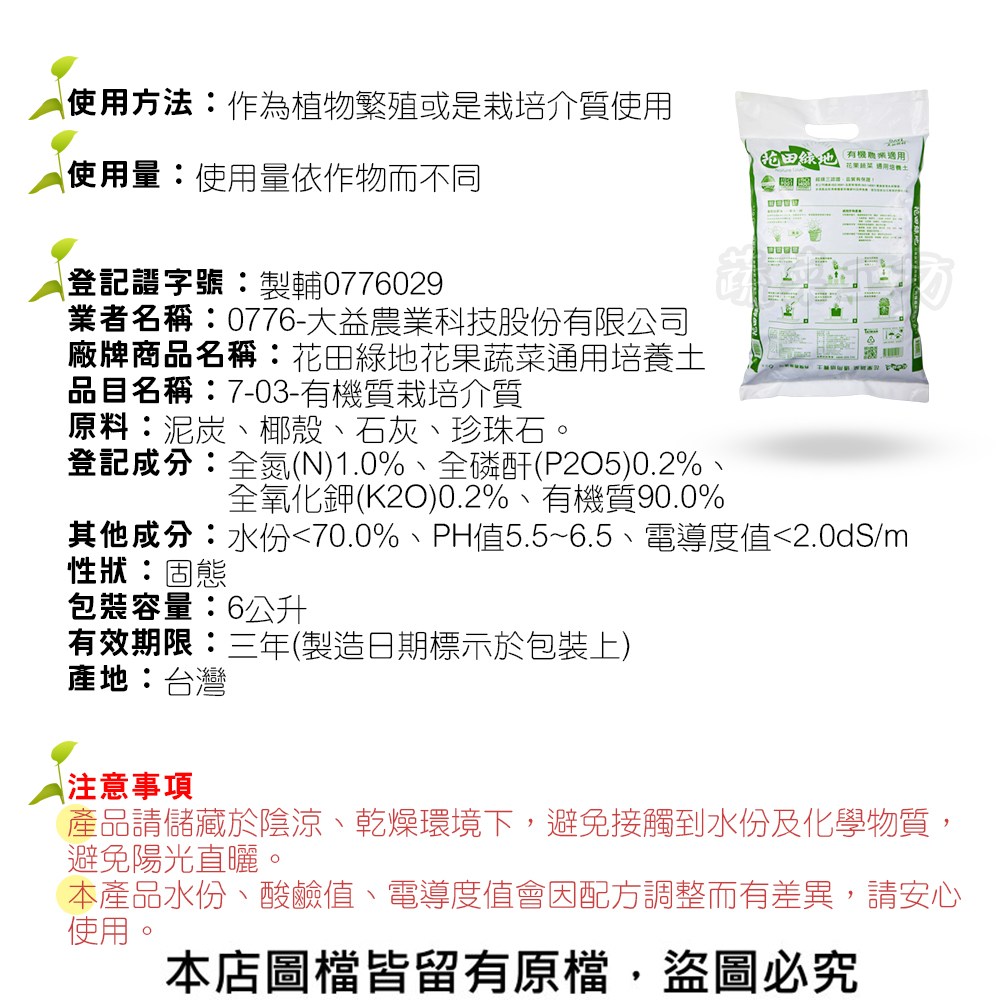 登記成分:全氮(N)1.0%、全磷酐(P2O5)0.2%、全氧化鉀(K2O)0.2%、有機質90.0%