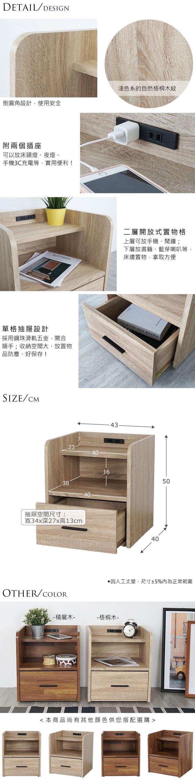 Homelike 喜家居附插座床頭櫃-2色可選(1976)梧桐木