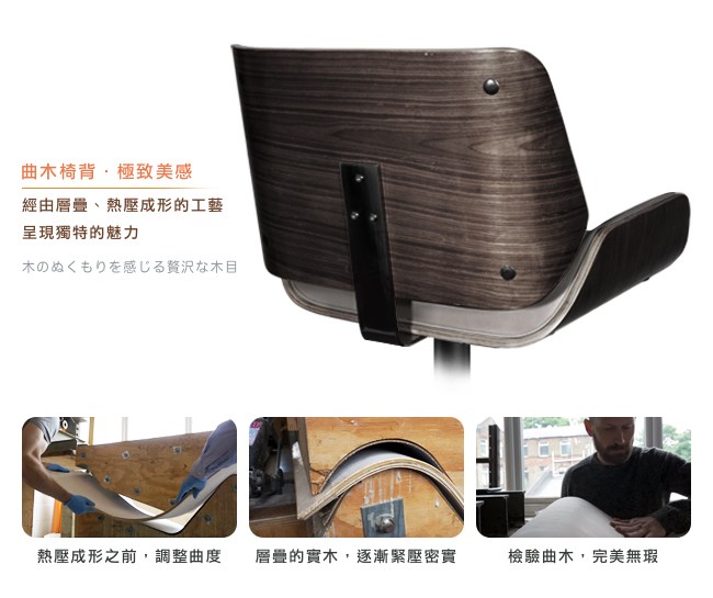 使用多層薄木板,以膠貼合後,熱壓彎曲而成。曲木家具線條自然,保持完整的木材紋理。在多層熱壓成型後,並不因此損壞木材纖維結構,具抗潮、抗扭、不開裂、不變形、經久耐用等優點。