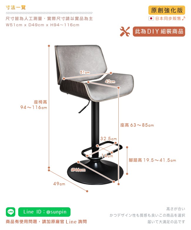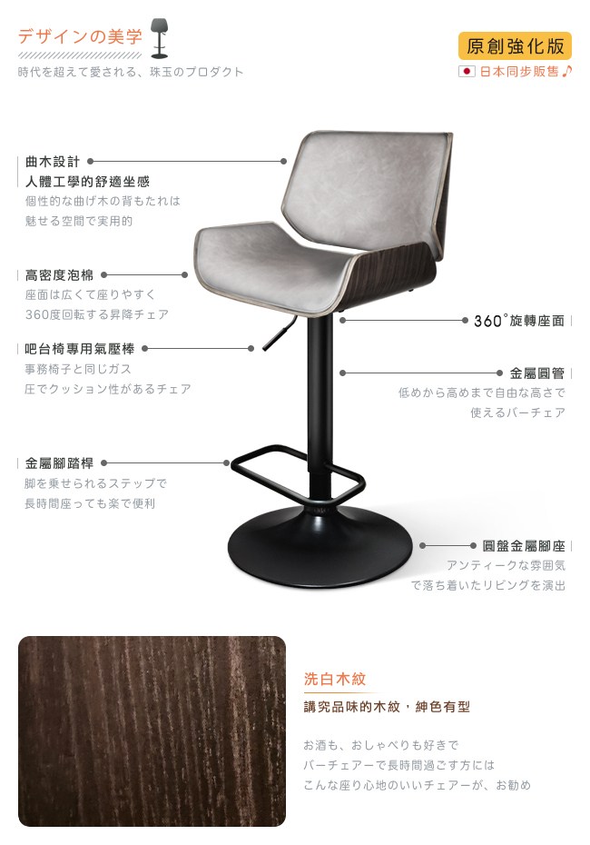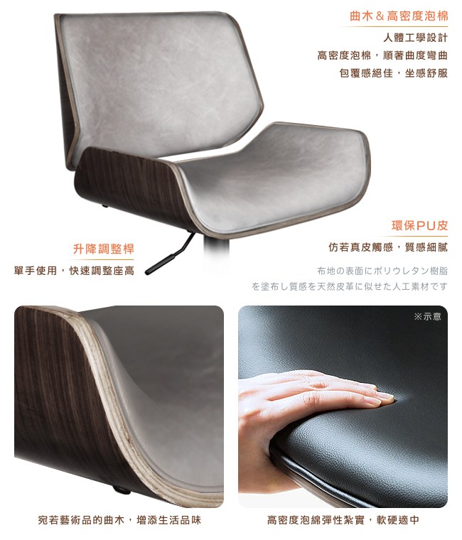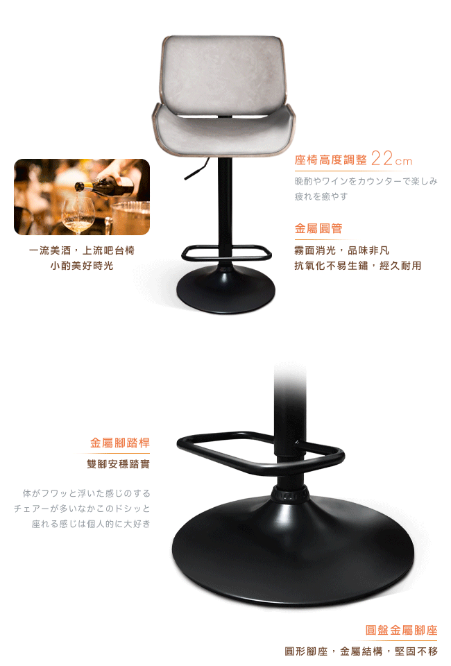 挑高的吧台椅,與眾不同的格調,提升用餐的氛圍。非常適合與廚房中島搭配,不佔空間,可以一邊料理美味食材,一邊與家人朋友談天說地,自然而然拉近彼此的距離。曲木的藝術設計與高密度泡綿,絕佳的包覆感,坐感舒適,久坐不累。環保 PU 皮,仿若真皮觸感,質感細膩。金屬霧面消光圓管,品味非凡,且抗氧化不易生鏽,經久耐用。隨個人喜好與身高,吧台椅可調高度 22cm,金屬腳踏桿方便雙腳踩踏。底座軟質止滑墊增加抓地力,更加安全牢固,且可避免刮花地板。