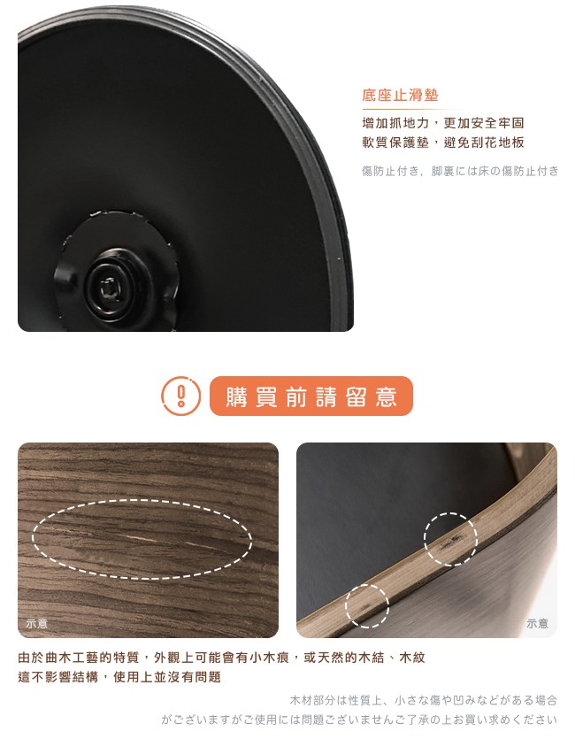 ・曲木工藝的特質,外觀上可能會有小木痕,或天然的木結、木紋,這不影響結構,使用上並無問題。