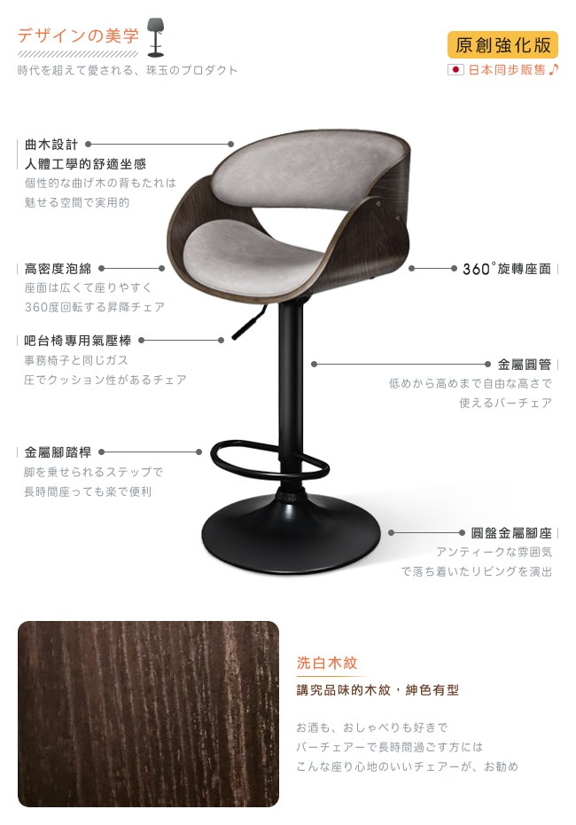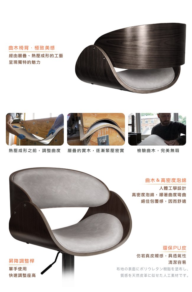 挑高的吧台椅,與眾不同的格調,提升用餐的氛圍。非常適合與廚房中島搭配,不佔空間,可以一邊料理美味食材,一邊與家人朋友談天說地,自然而然拉近彼此的距離。曲木的藝術設計與高密度泡綿,絕佳的包覆感,坐感舒適,久坐不累。環保 PU 皮,仿若真皮觸感,質感細膩。霧面消光,金屬圓管腳座,品味非凡,且抗氧化不易生鏽,經久耐用。隨個人喜好與身高,吧台椅可調高度 22cm,金屬腳踏桿方便雙腳踩踏。底座軟質止滑墊增加抓地力,更加安全牢固,且可避免刮花地板。
