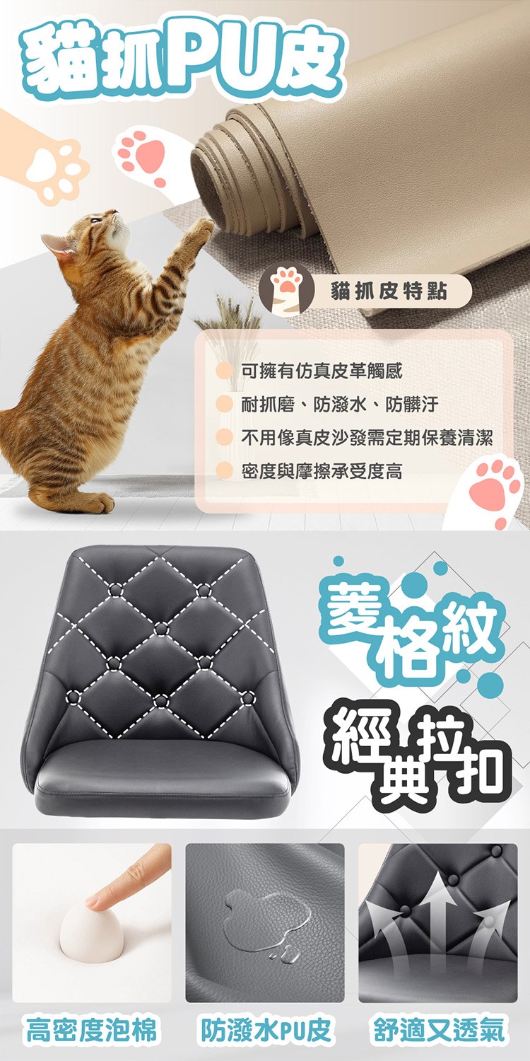 * 防潑水PU貓抓皮設計滑順易清潔