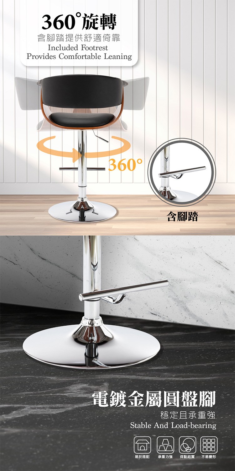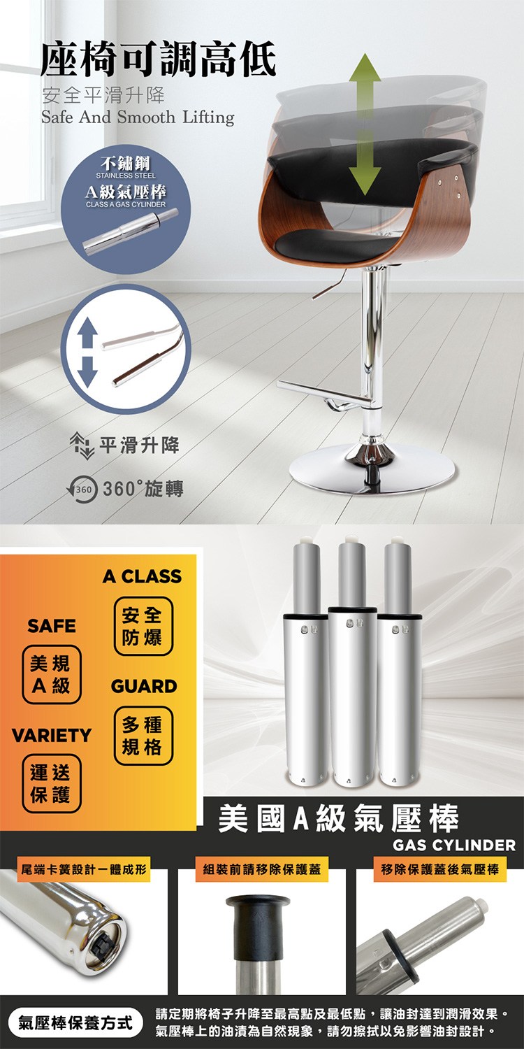配備美規A級氣壓棒、安全升降,360°旋轉含有腳踏提供舒適倚靠,電鍍金屬圓盤腳、穩定且承重強,
