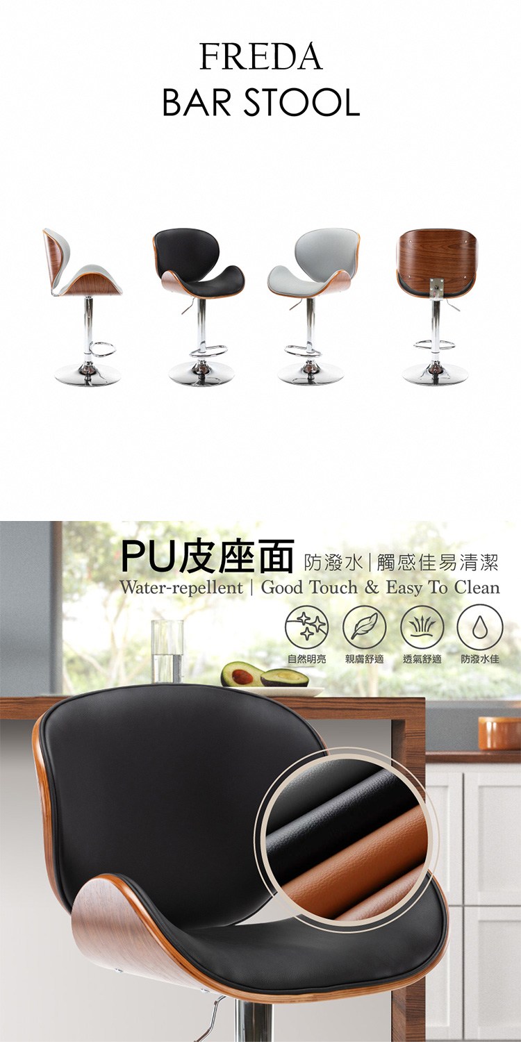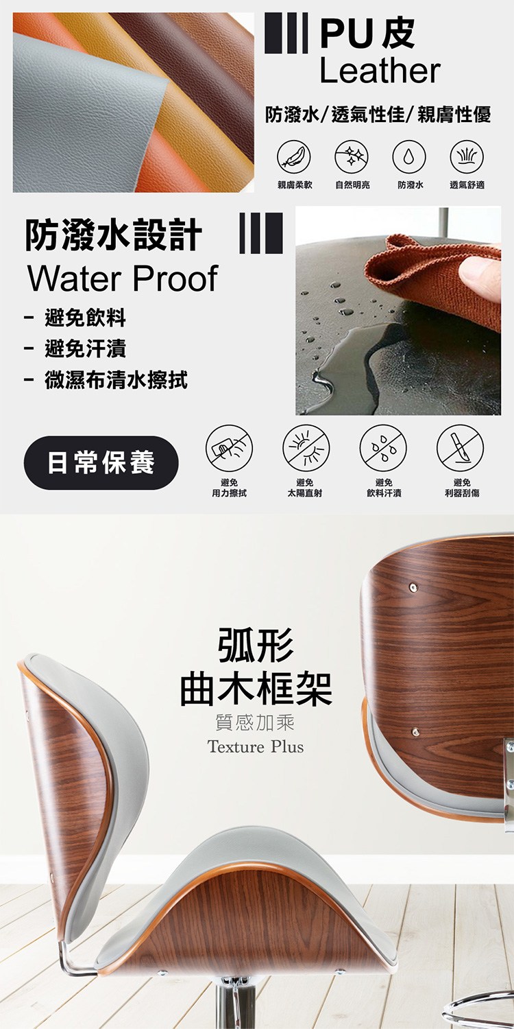台灣與歐美同步販售、美規設計,防潑水PU皮座面,觸感佳易清潔,搭配獨特弧形曲木框架質感加乘,
