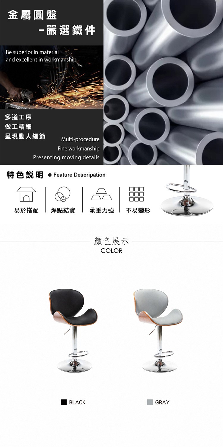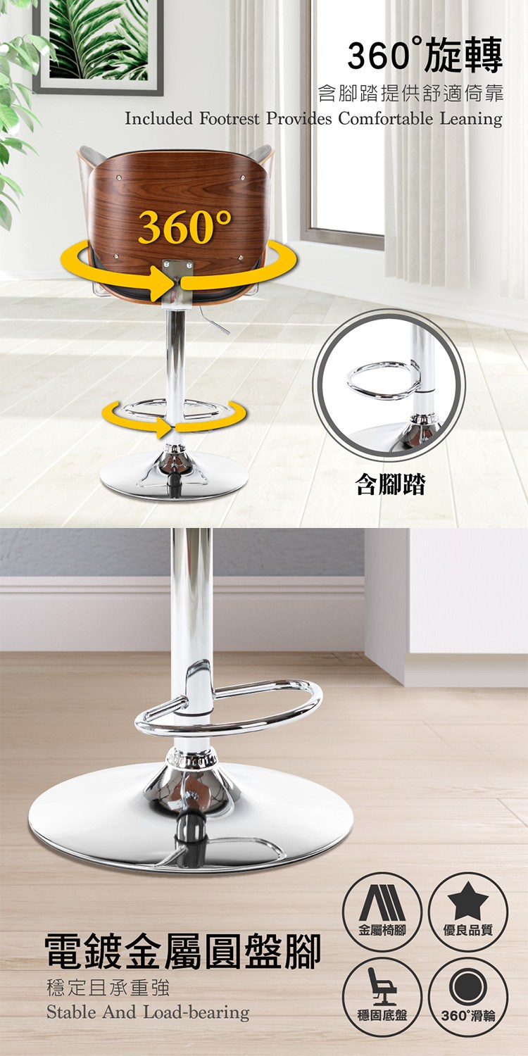 電鍍金屬圓盤腳、穩定且承重強,易於搭配的顏色為空間注入創意,可配合吧檯或中島,享受完全的機動性。