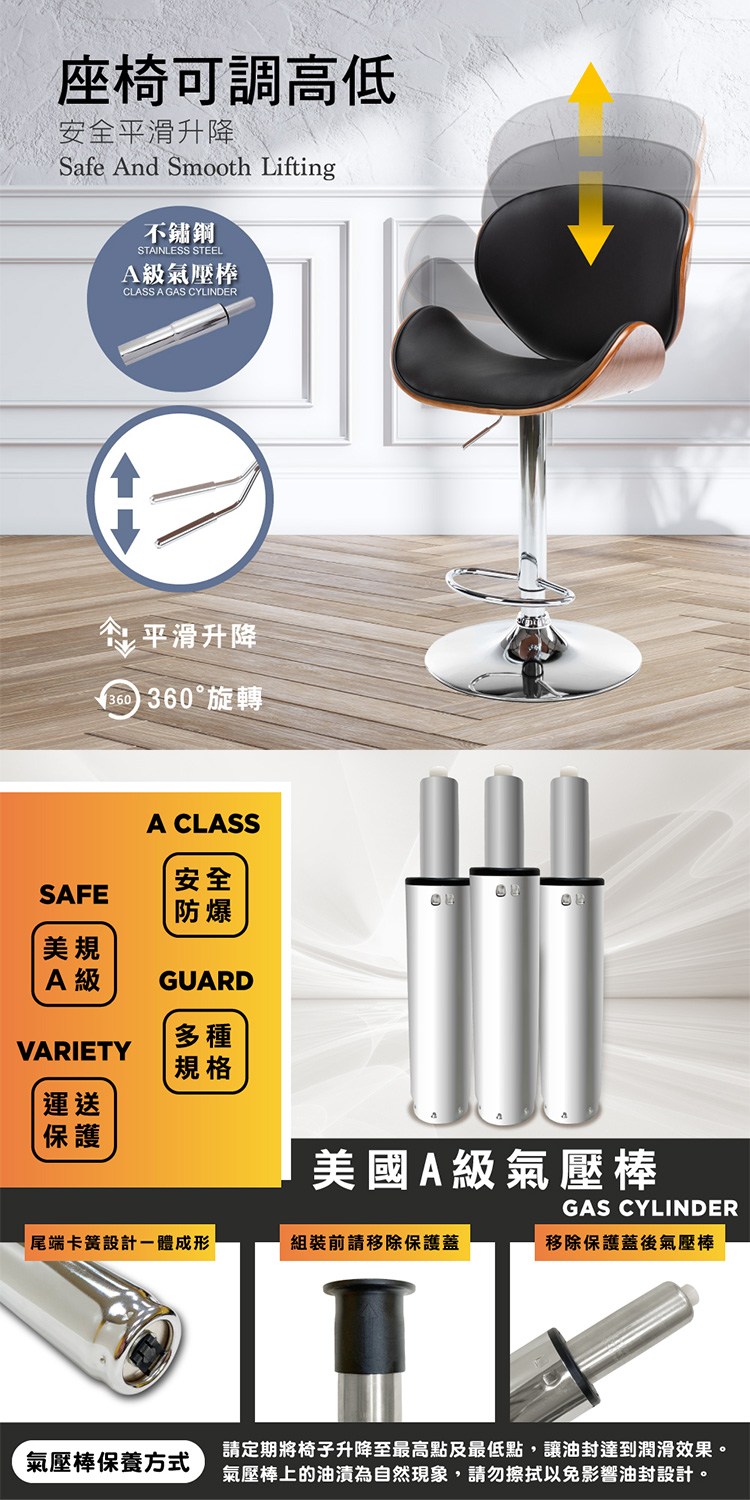 高密度泡棉椅背及椅座坐感舒適,配備美規A級氣壓棒、安全升降,360°旋轉含有腳踏提供舒適倚靠,