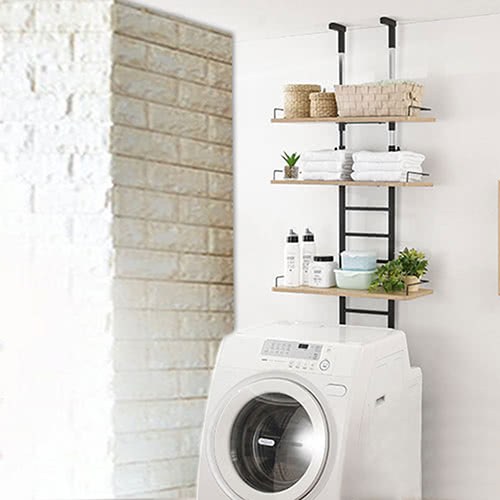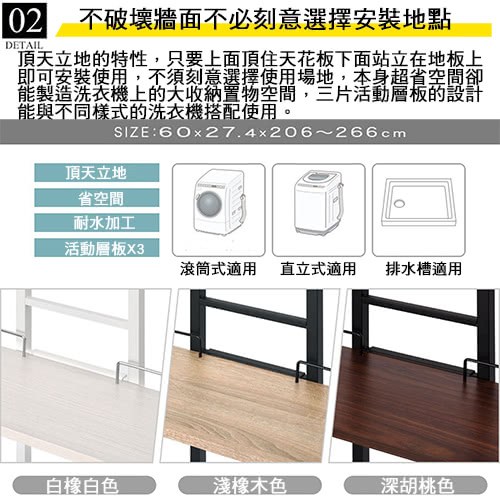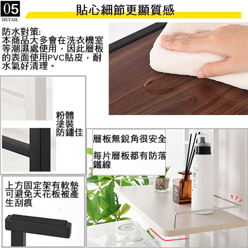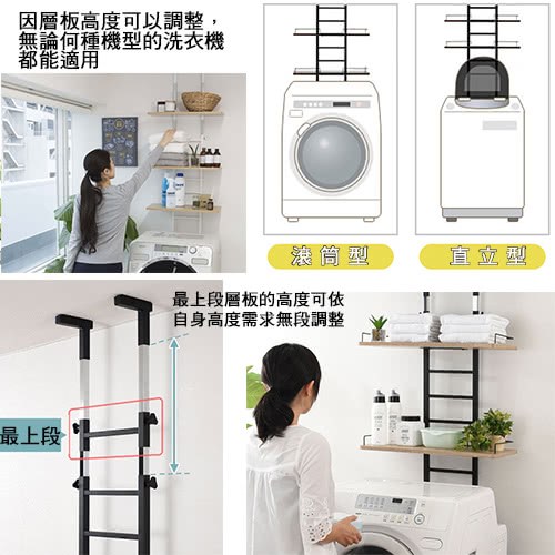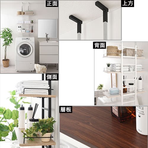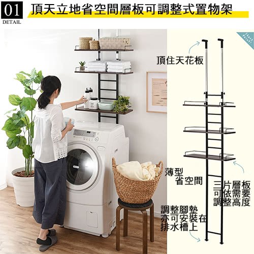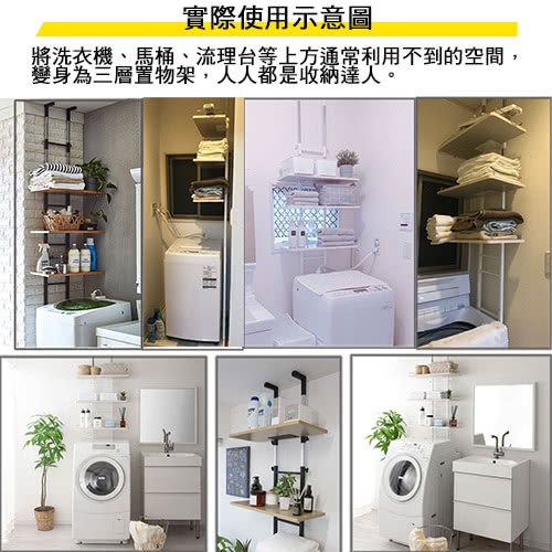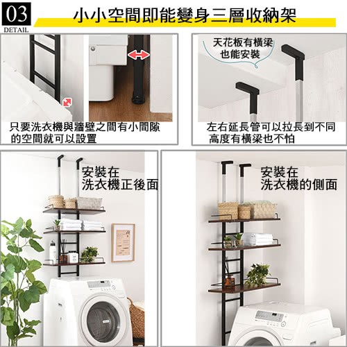 頂天立地式壁面層架 極省空間是本商品的設計重點,從天花板到地板穩穩支撐著,不須大興土木也不用於牆壁鑽孔破壞牆面,不必刻意選擇安裝場地,只要在洗衣機與牆壁之間留下比鐵管的寬度再多一點點的距離即可設置,讓您在洗衣機上方原本利用不到的空間多了三層的置物層架,層板高度可以調整,可以與不同樣式的洗衣機搭配使用。