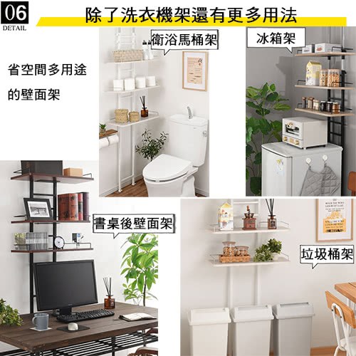 因為是壁面層架的概念,因此除了洗衣機架之外,也十分適合與冰箱、流理台、馬桶、書桌等搭配使用,充分利用上面本來無法使用的空間,人人都會是收納達人哦。