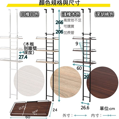 尺寸 : 約(W)60 x (D)27.4 x (H)206~266cm (高度不足者可聯繫組裝說明書內的廠商資料購買60公分加長管,最高可增高至326cm以內)