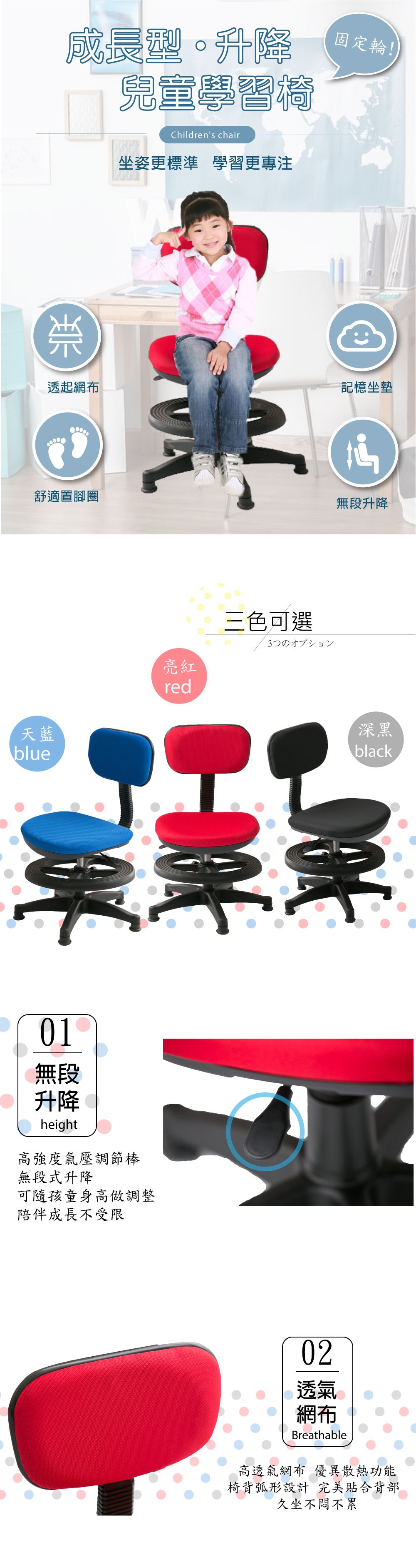 A1-點點繽紛固定式兒童成長電腦椅 2色可選 1入(箱裝出貨)