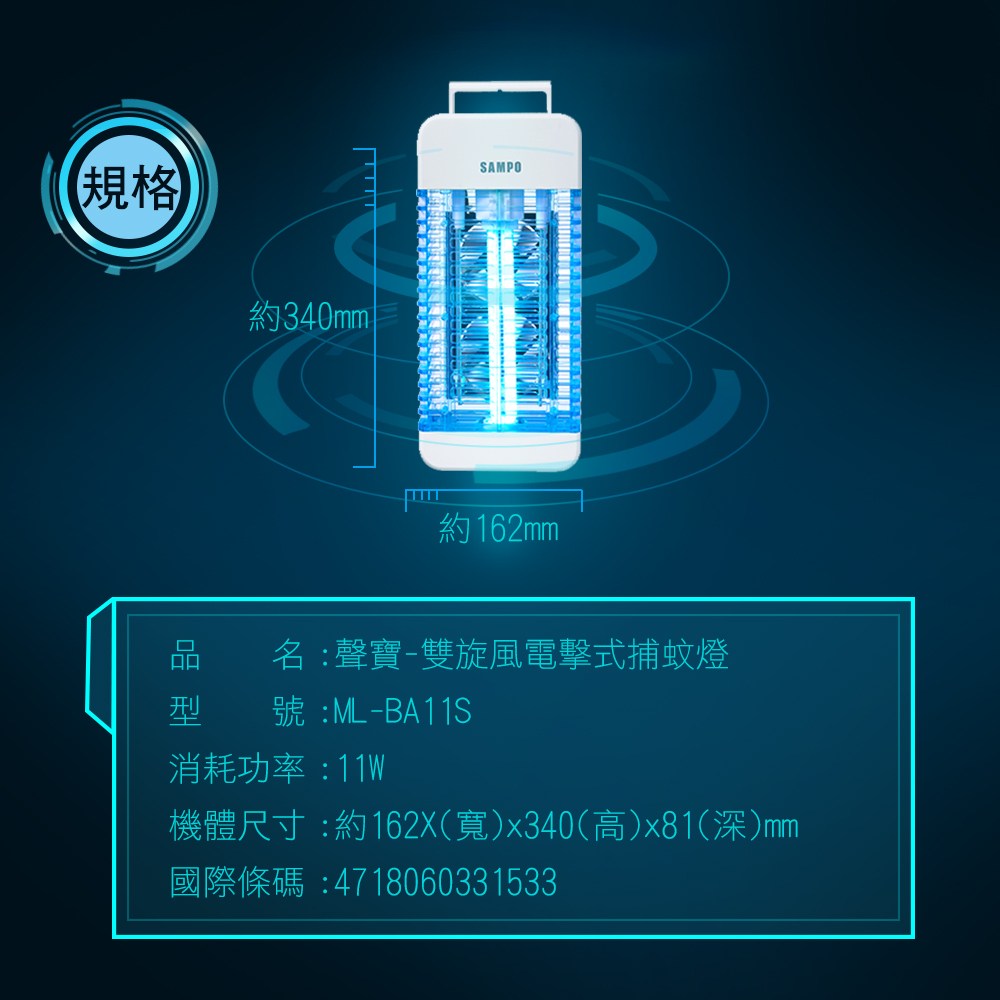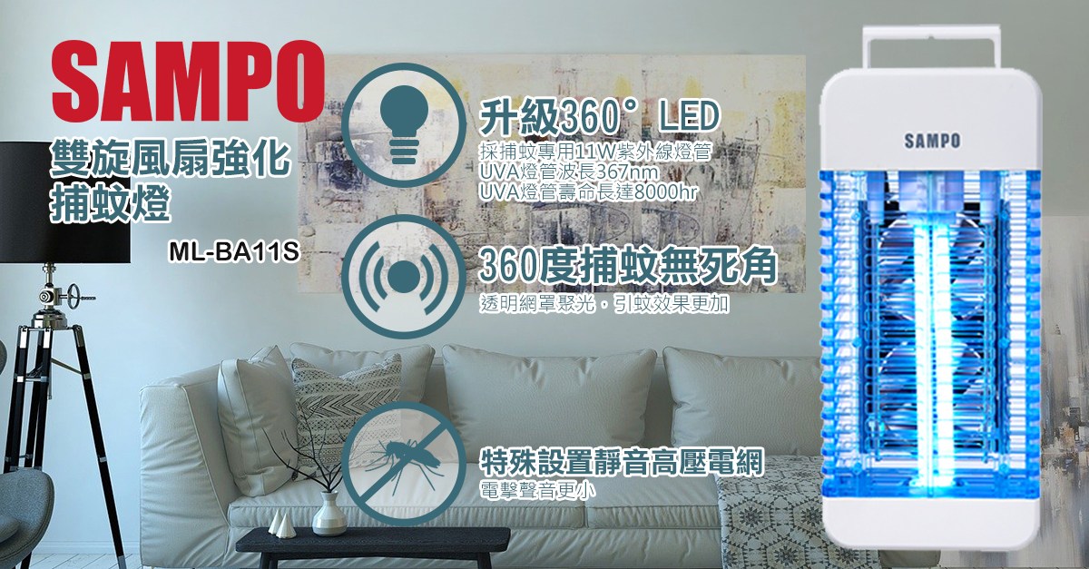 聲寶 11W雙旋風電擊式捕蚊燈 (ML-BA11S)