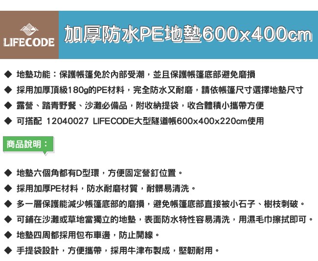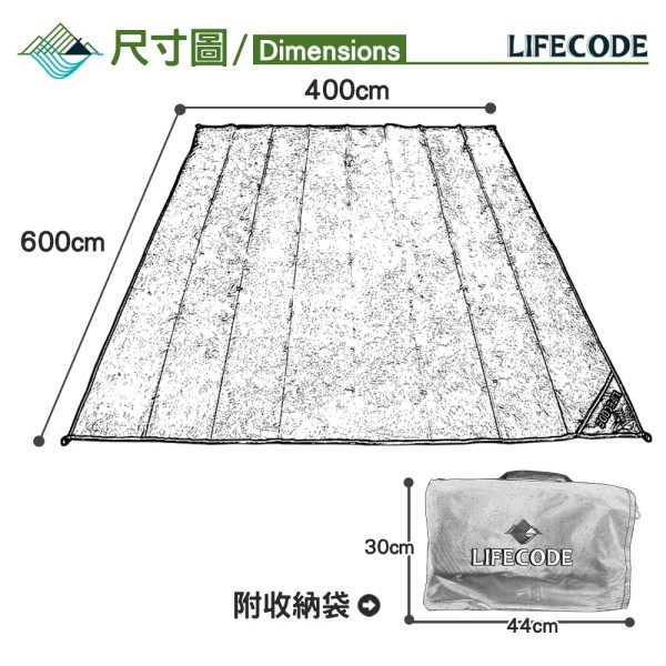 Lifecode 生活密碼 加厚防水PE地墊 180g PE材質+600D牛津布包邊 附收納袋 灰黑色 300 x 300cm