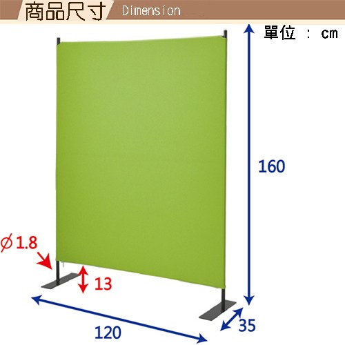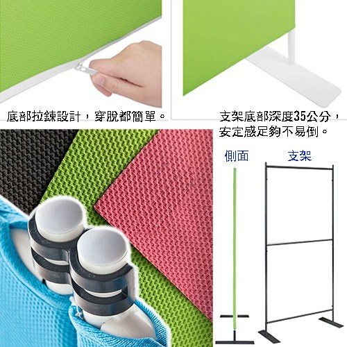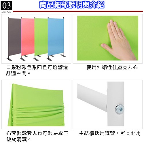 可依需要組裝為雙腳(單獨使用)或單腳(連接加寬使用),單面寬度120公分、高度160公分,單獨使用即能發揮屏風遮蔽的功能,主支架採用烤漆鐵管堅固耐用不變形,組裝簡單輕量可攜,中間則採用日式炫彩vivid色系的可拆洗彈性壓克力布套,多彩四色可選搭配黑與白兩色的鐵架,活潑您的使用空間,營造自我風格。