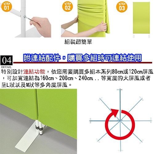 克洛屏風系列的寬度共有80cm、120cm兩種選擇,雙腳與單腳購買兩組連結之後可加寬到160cm、200cm、240cm,寬度可完全依您的需求,靈活性超強。