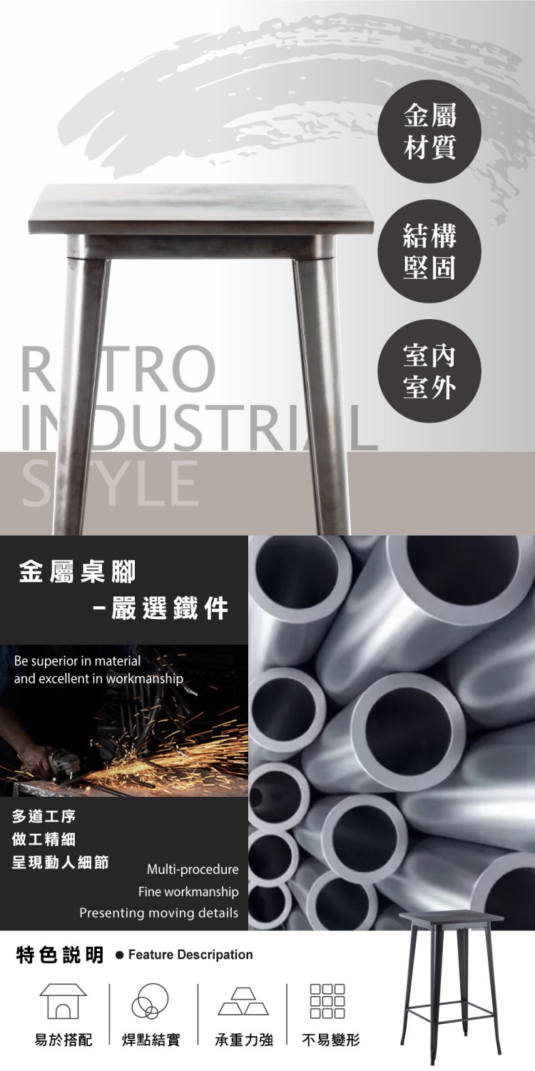 吧檯桌底部設計腳踏、舒適休憩,配有塑膠的腳墊、貼心不傷地板,工業風搭配與各式空間完美契合,
