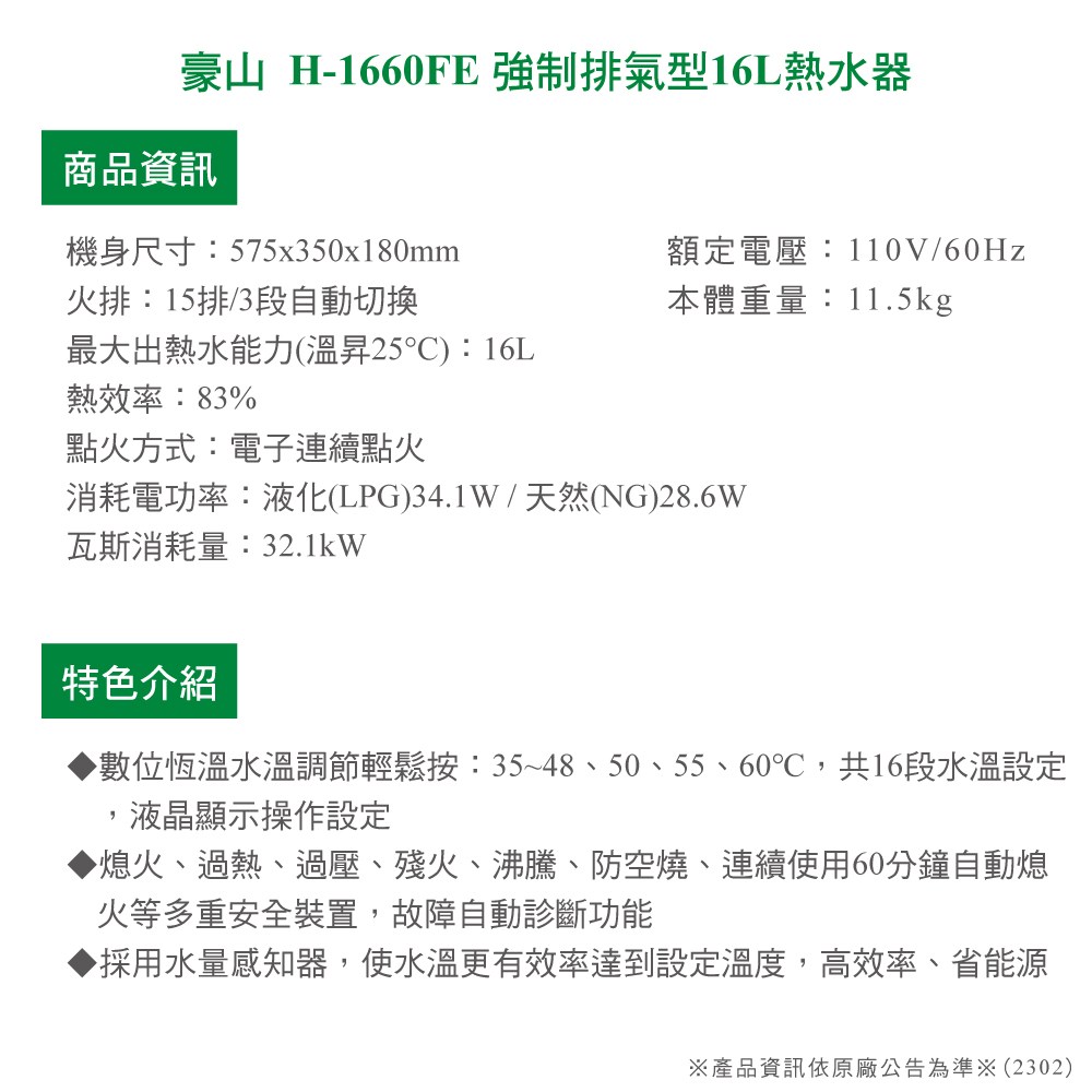 品名:屋內強制排氣式16L熱水器