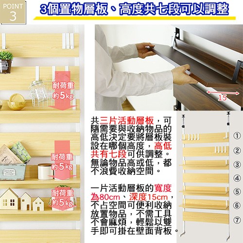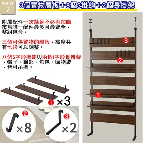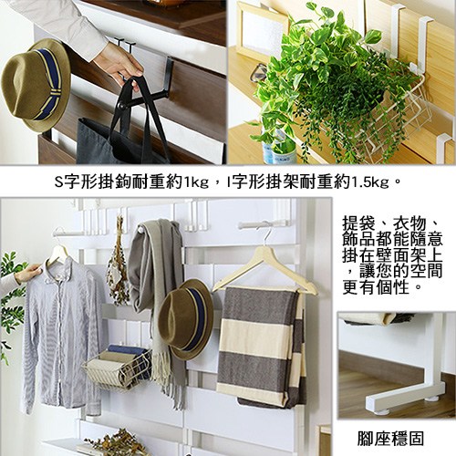 工業風棧板造型的壁面省空間是本商品的設計重點,配件數量與市售類似品相比最多最齊全, 一次給足不必再加購。 八個S字形掛鉤與 兩個I字形長掛架適用於掛衣、掛袋或掛物。從上到下共有 七片棧板 造型的背板可供安裝活動層板,您可自行決定將 三片層板安裝在任一個您想安裝的高度,完全符合您自身的使用需求,客製化般的貼心猶如量身訂做。