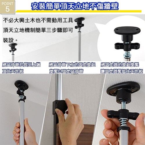 頂天立地的設計,從天花板到地板穩穩支撐著,不須大興土木也不用於牆壁鑽孔,三個步驟即可簡單設置。