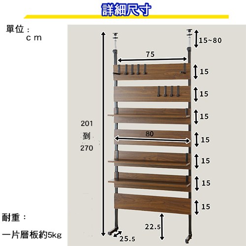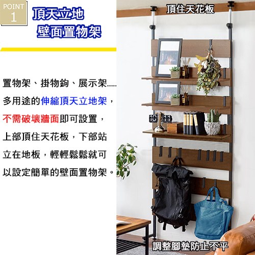 不傷害現有的壁面,不必鑽孔不用釘牆壁,就像牆壁內建的壁面收納架, 頂天立地的設計,層板可自在的調整高度,加上不同功能的掛架,設計新穎實用,簡單安裝就能擁有屬於您的收納與展示空間。