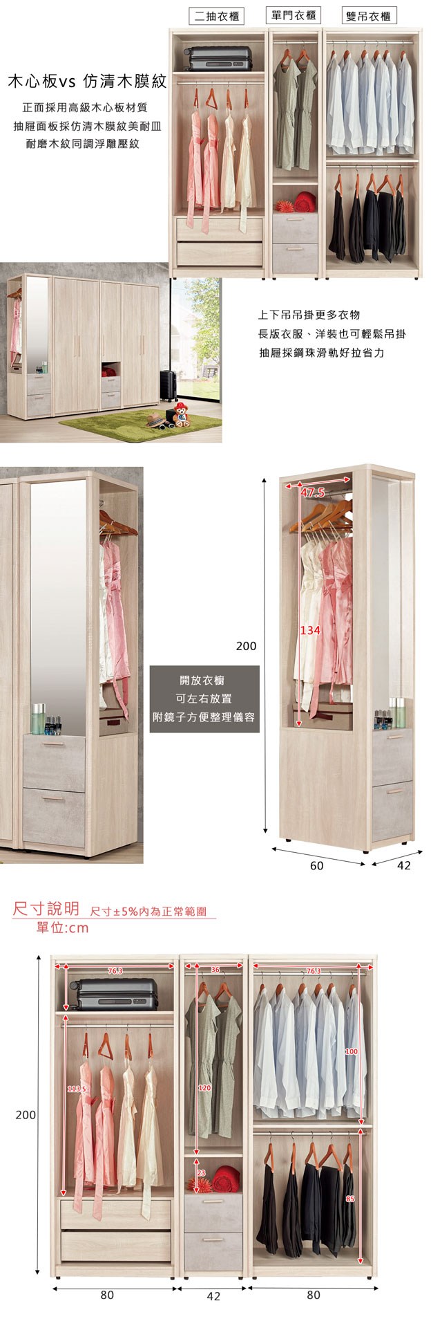 直人木業-北歐白楓木標準衣櫃195公分(全白雙門75公分+三抽75公分+開放櫃45公分)
