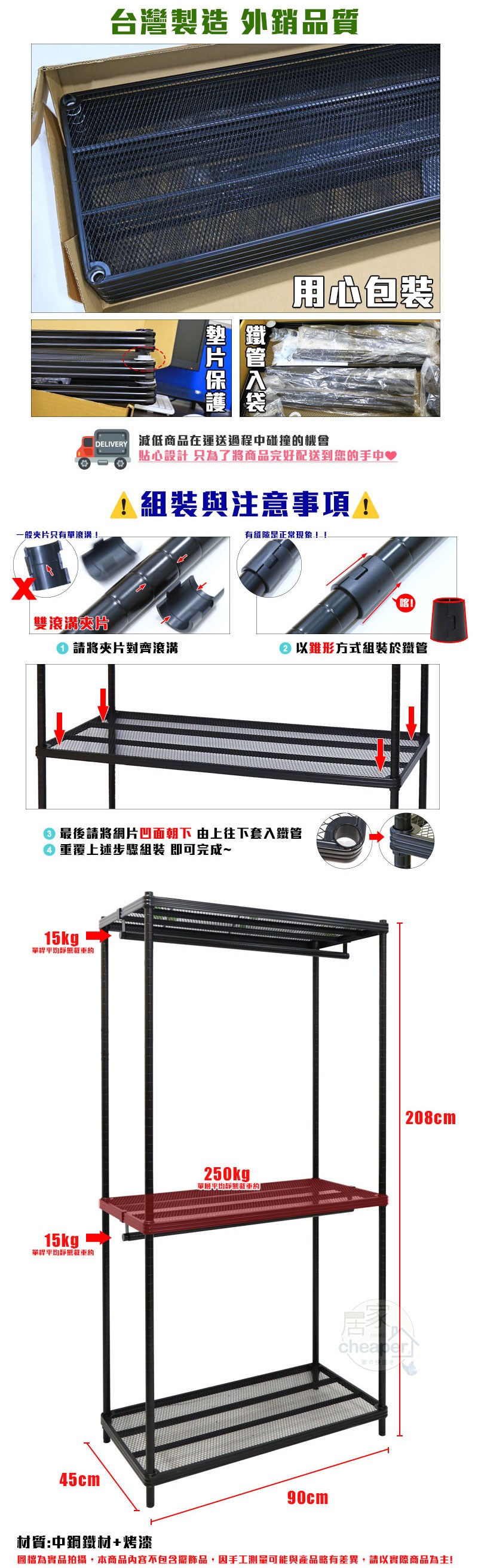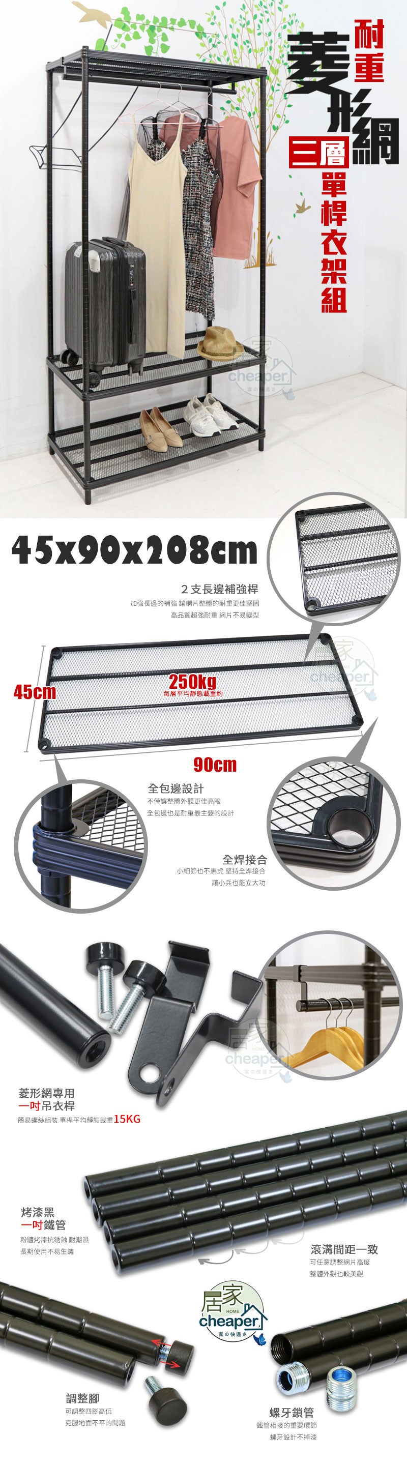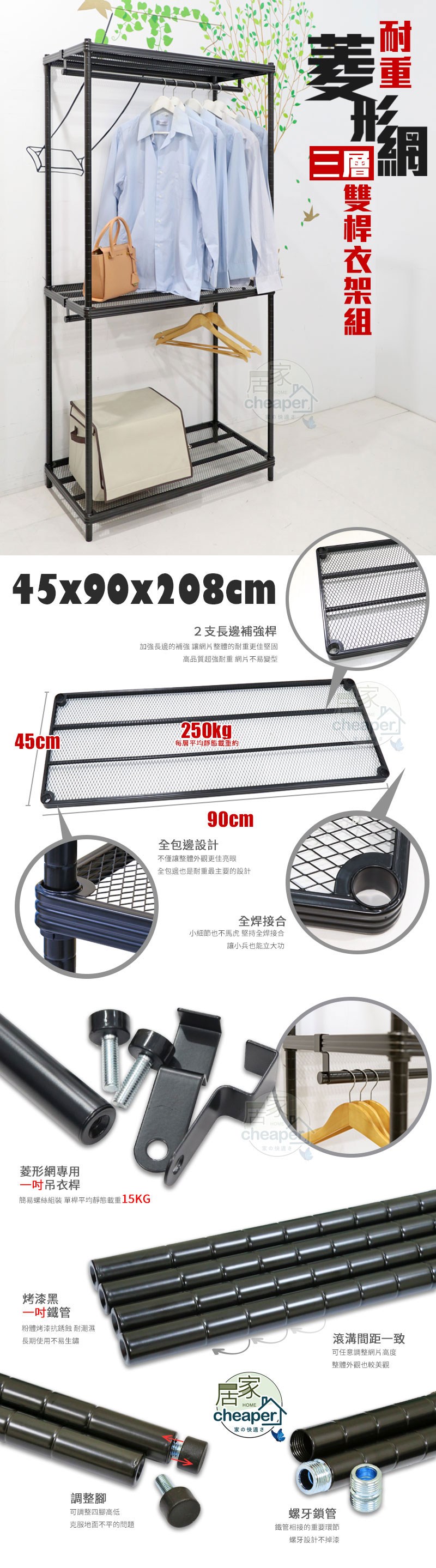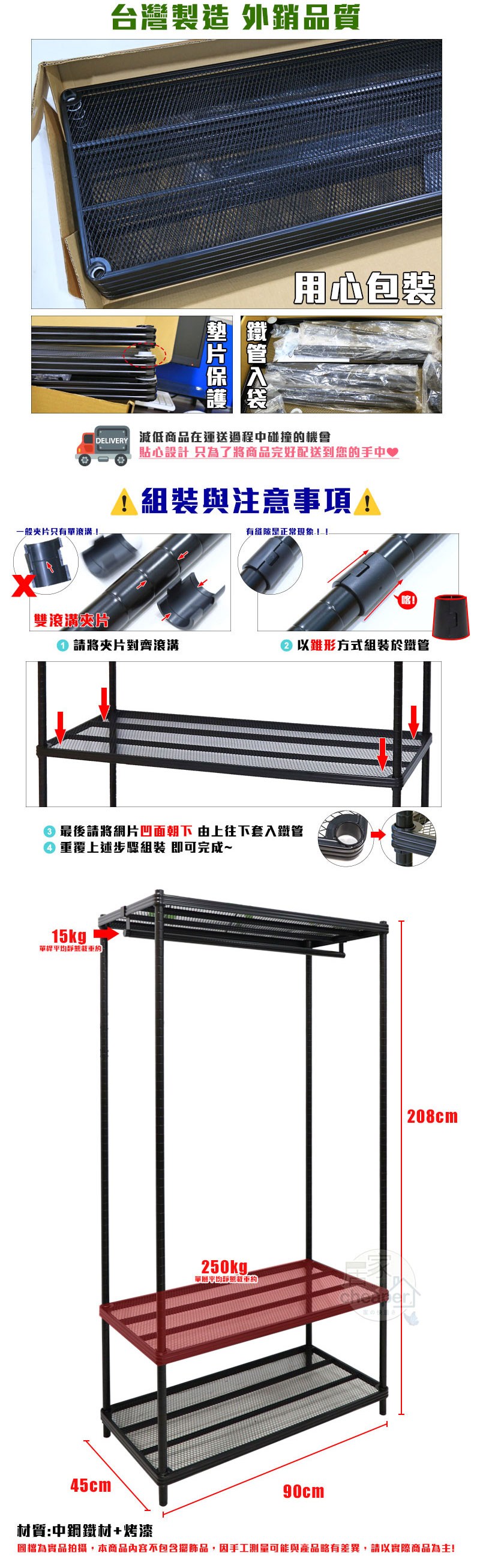 dayneeds 沖孔 90x45x180cm 三層烤漆單桿衣櫥 鐵架衣櫥/掛衣架/衣物收納