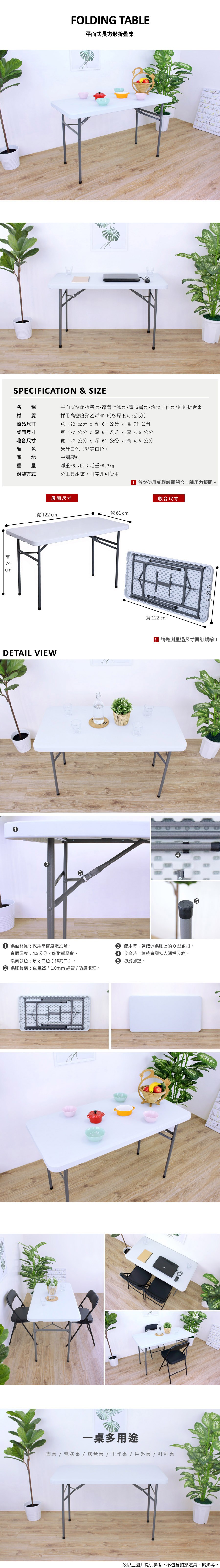 ◆桌面(4尺寬度)厚型(4.5公分厚度),寬122x深61x高74/公分,平面式折疊桌/書桌/電腦桌/餐桌/工作桌/露營桌/洽談桌/拜拜桌。
