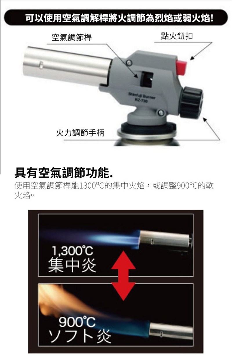 2. 利用空氣調節閥來調整火焰強度及火焰類型。全開時,為藍色的高溫集中炎。
