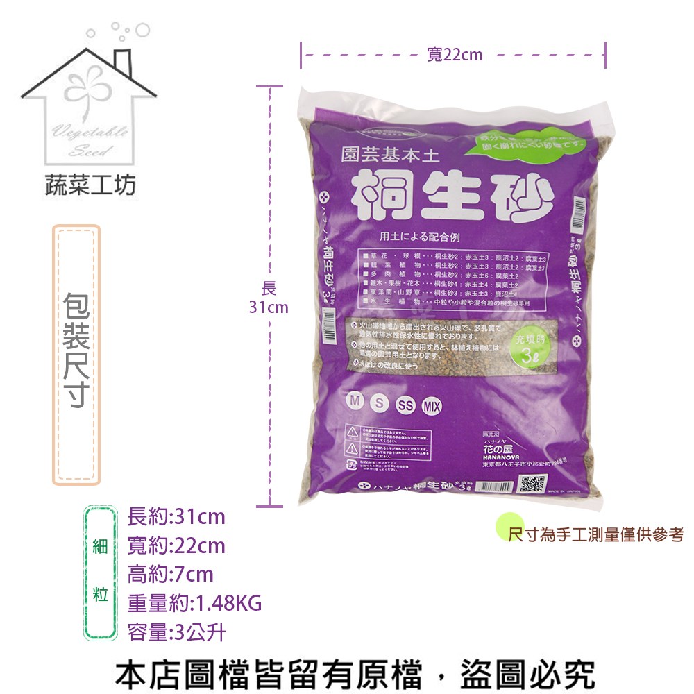 ‧桐生砂是一種火山沙,以產地日本桐生命名,含有大量Fe2O3(氧化鐵),質量較重,ph值為弱酸性。