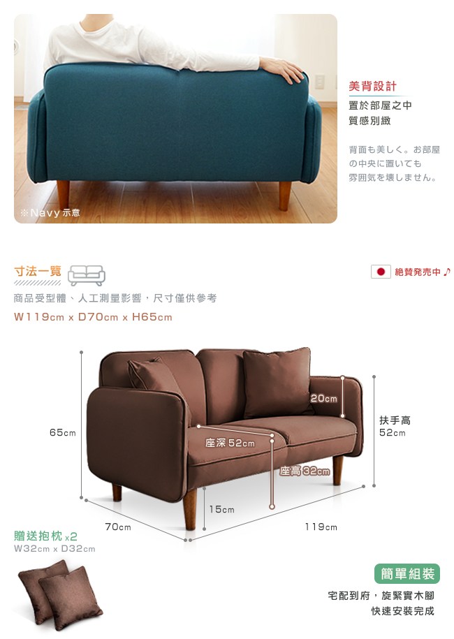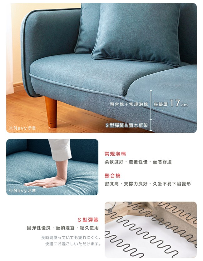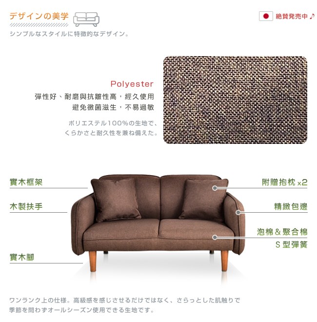 日本同步販售,品質優良。經久使用的Polyester布料,彈性好、耐磨與抗皺性高,避免黴菌滋生,不易過敏。精緻包邊,強化布面結構,不易脫線,耐久使用。座墊使用多層結構:常規泡綿。柔軟度好,包覆性佳,坐感舒適;聚合棉。密度高,支撐力良好,久坐不易下陷變形;S型彈簧。回彈性優良,坐躺適宜,經久耐用。