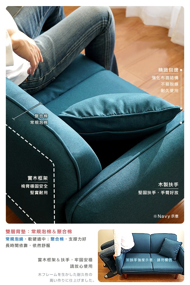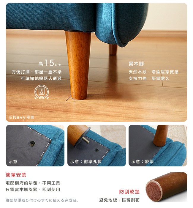 使用實木框架、木製扶手,沙發穩固安全,請放心長期使用。實木腳的天然木紋,增添居家質感,支撐力強,堅實耐久。實木腳高15cm,方便打掃,部屋一塵不染,可讓掃地機器人通過。防刮腳墊,避免地板、磁磚刮花。美背設計,置於部屋之中,質感別緻。
