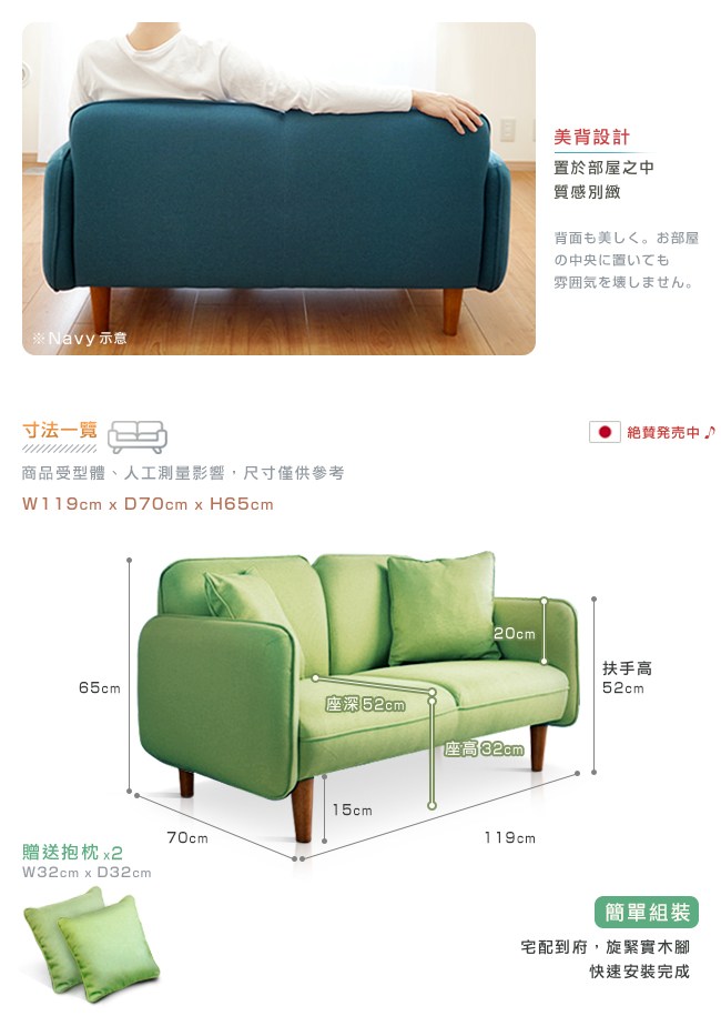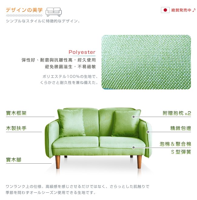 日本同步販售,品質優良。經久使用的Polyester布料,彈性好、耐磨與抗皺性高,避免黴菌滋生,不易過敏。精緻包邊,強化布面結構,不易脫線,耐久使用。座墊使用多層結構:常規泡綿。柔軟度好,包覆性佳,坐感舒適;聚合棉。密度高,支撐力良好,久坐不易下陷變形;S型彈簧。回彈性優良,坐躺適宜,經久耐用。