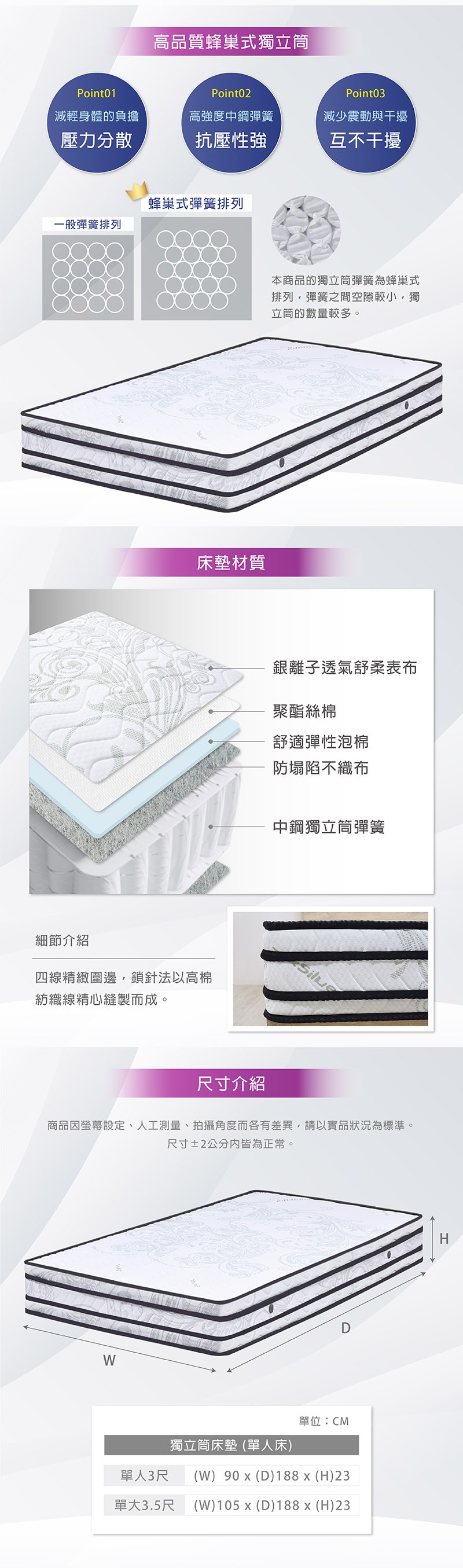 Albert艾柏 抗菌透氣3.5尺單人獨立筒床墊(3.5x6.2尺)-105x188x25cm