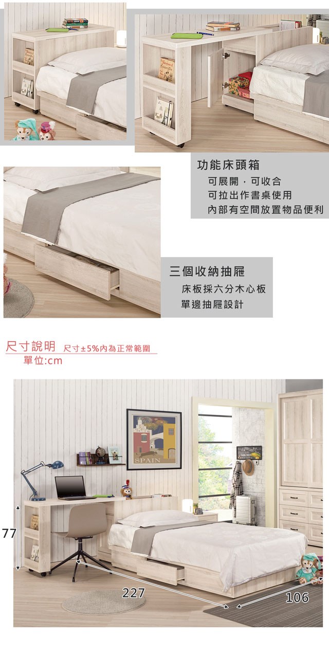 WAKUHOME 瓦酷家具Molly日系無印風三抽3.5尺床箱型2件組(床頭箱+床底)-寬106.3*深201.7*高100cm